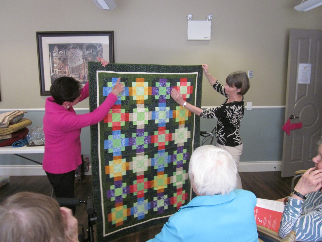 Here are a couple of pictures from our last Have Quilts Will Travel. We went to Churchill House here in North Van. Residents enjoyed hearing the short history of quilting and seeing quilts made by our members.