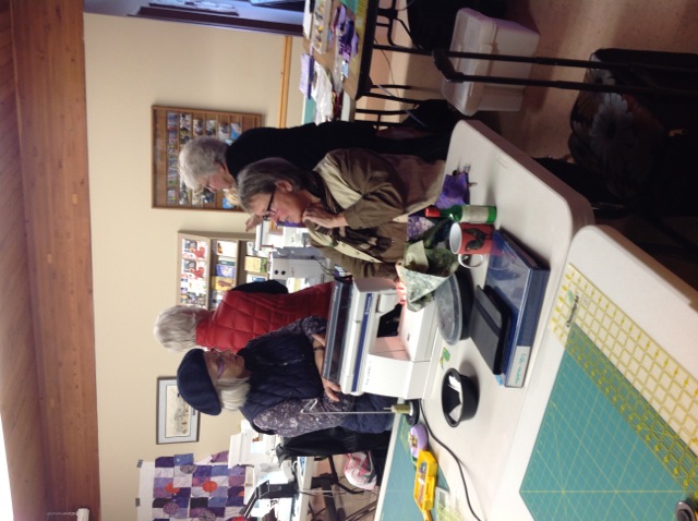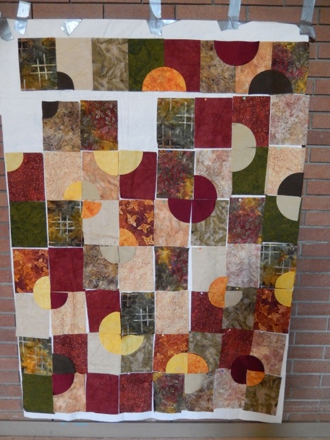 On the first day backgrounds were designed with either rectangles or half square triangles. Those working with rectangles brought rectangles from 12 fabrics in colour runs from light to dark. Those working with HST’s brought two main colour runs and one accent colour run, light to dark.