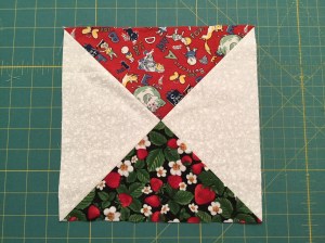 The January block is the Hourglass block.  The directions are … on the January Block of the Month page.  You can choose to make the block with any fabric with red in it.  It could be abstract, floral, child print, … . Have fun.