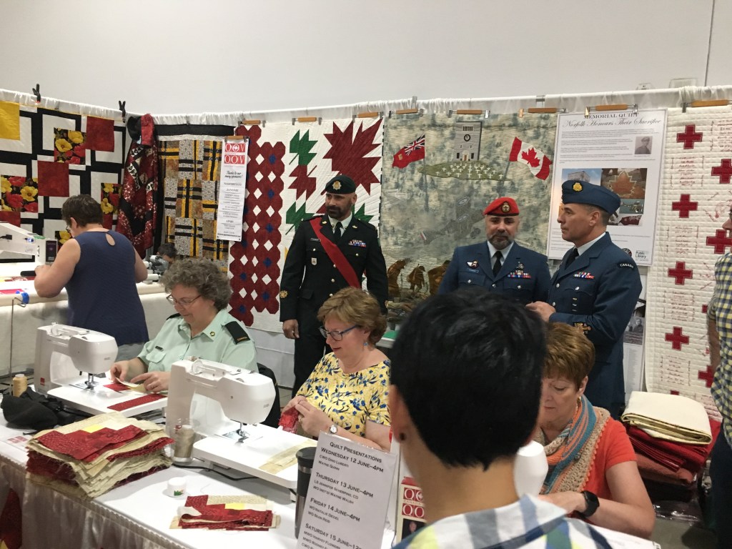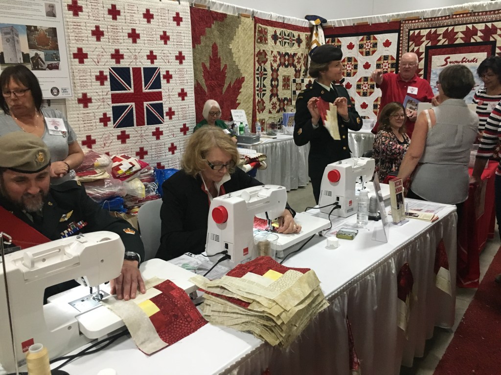 We particularly enjoyed the booth for the Quilts of Valour. They had machines there for anyone to make the red, white, and yellow blocks. They had a longarm quilting machine in the booth and were quilting quilts. We even saw serving soldiers sewing blocks. We went to a presentation of quilts.