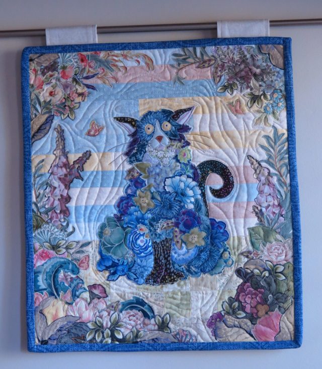 From Judy S … “I finished the project I started at the Floral Fabric Collage Workshop in February and learned some new techniques along the way. This little quilt (15.5 x 17.5 inches) makes me chuckle when I look at it.”