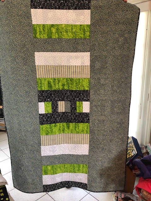 “Below left is my Temecula Mystery Quilt-Along quilt, which needs sashing and binding. On the right is my “L” quilt, made in the desert this winter.”