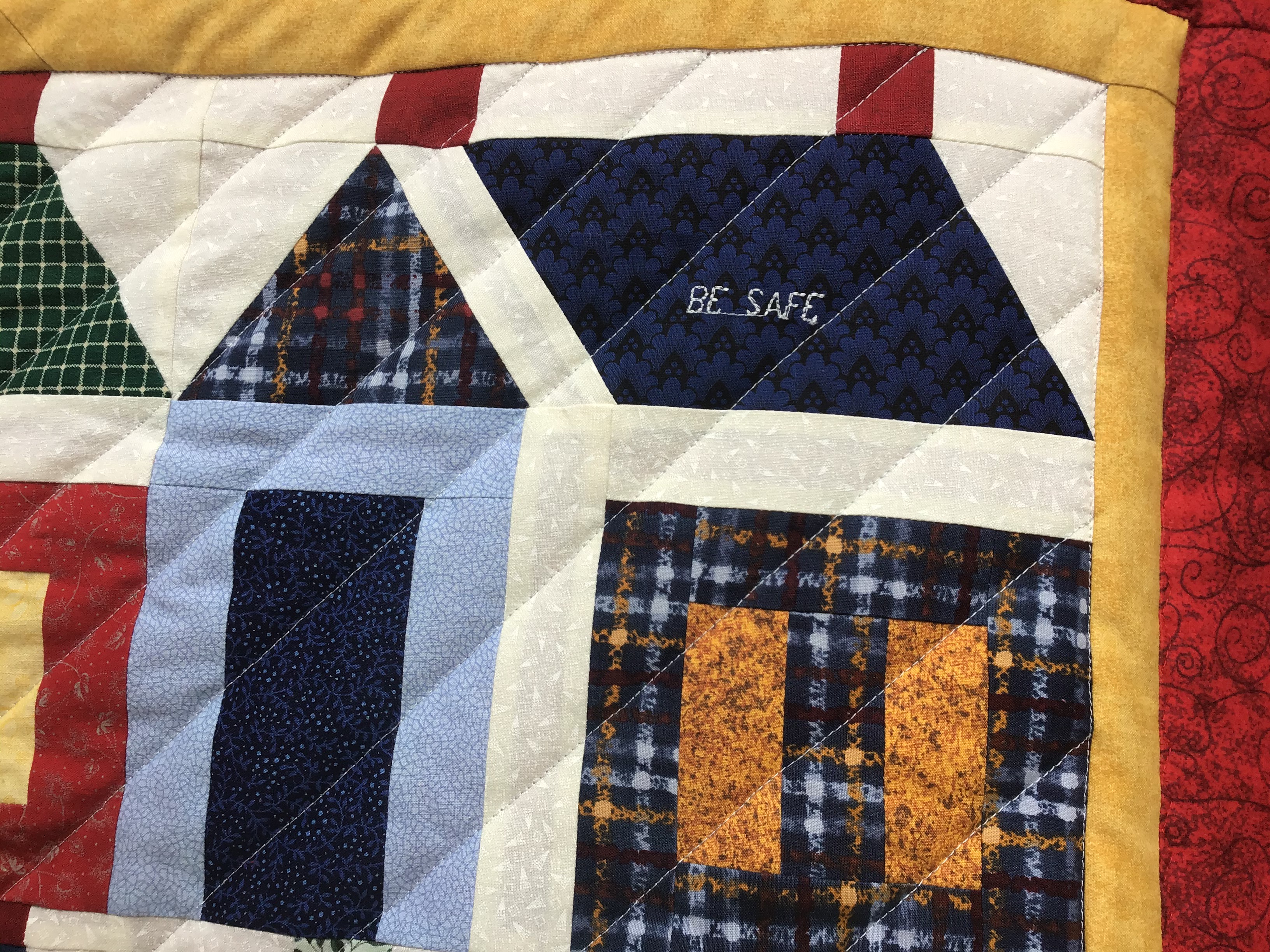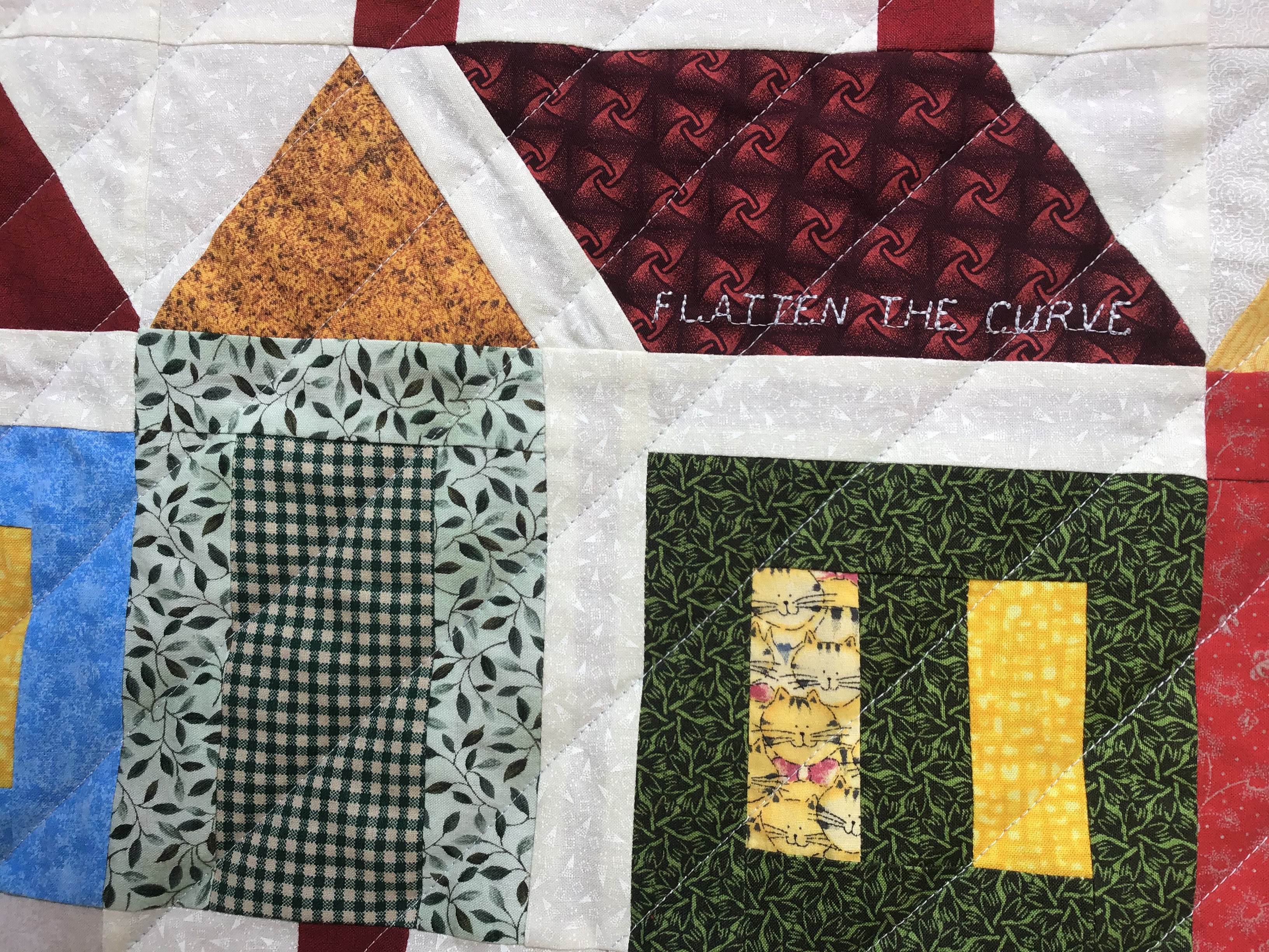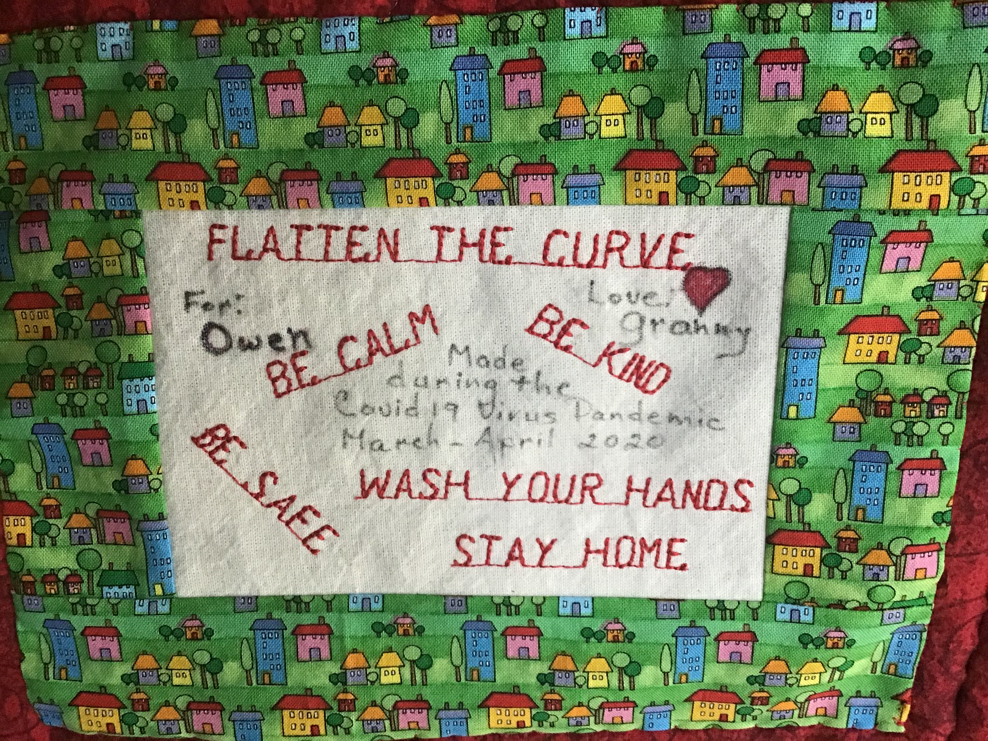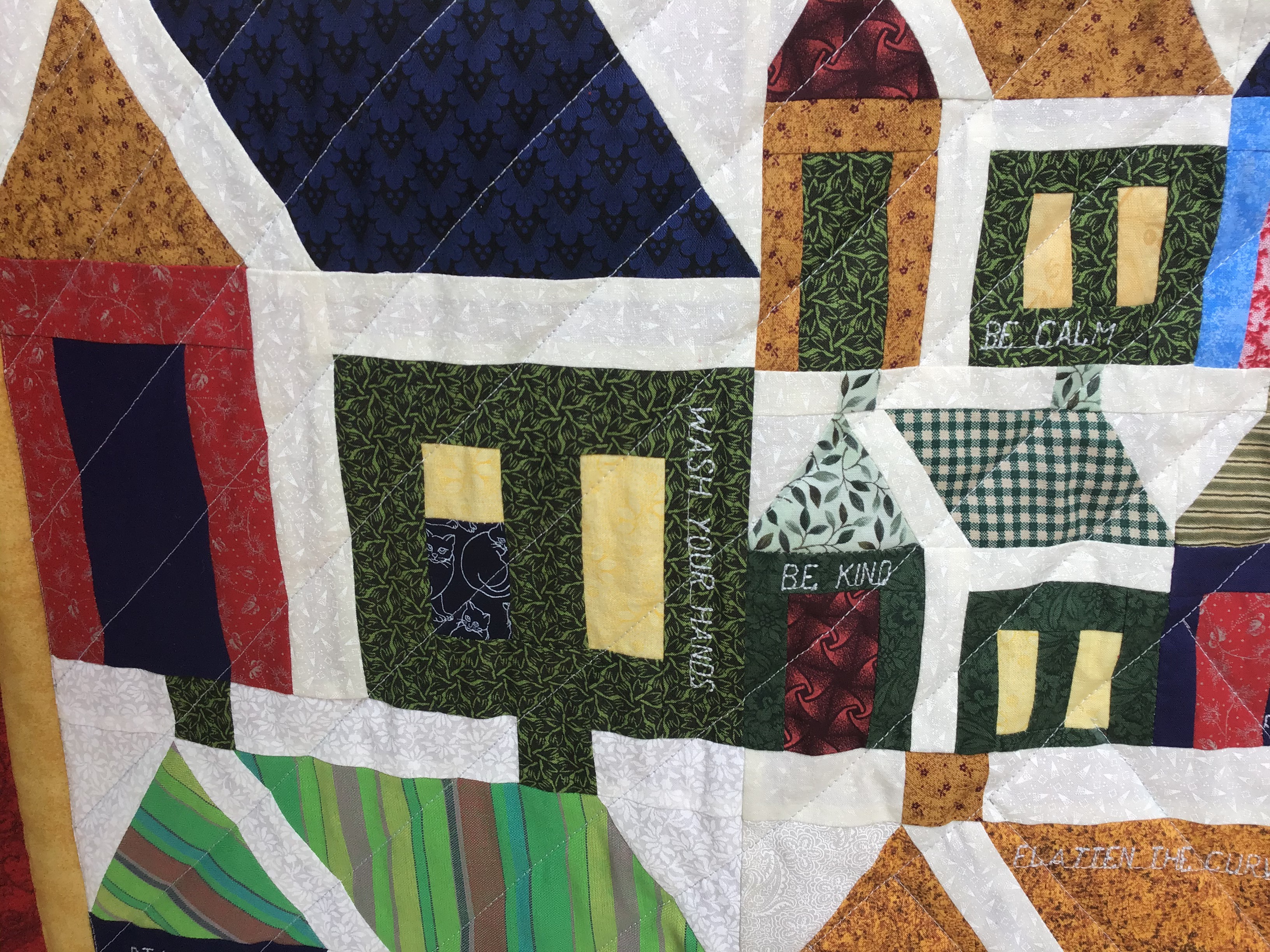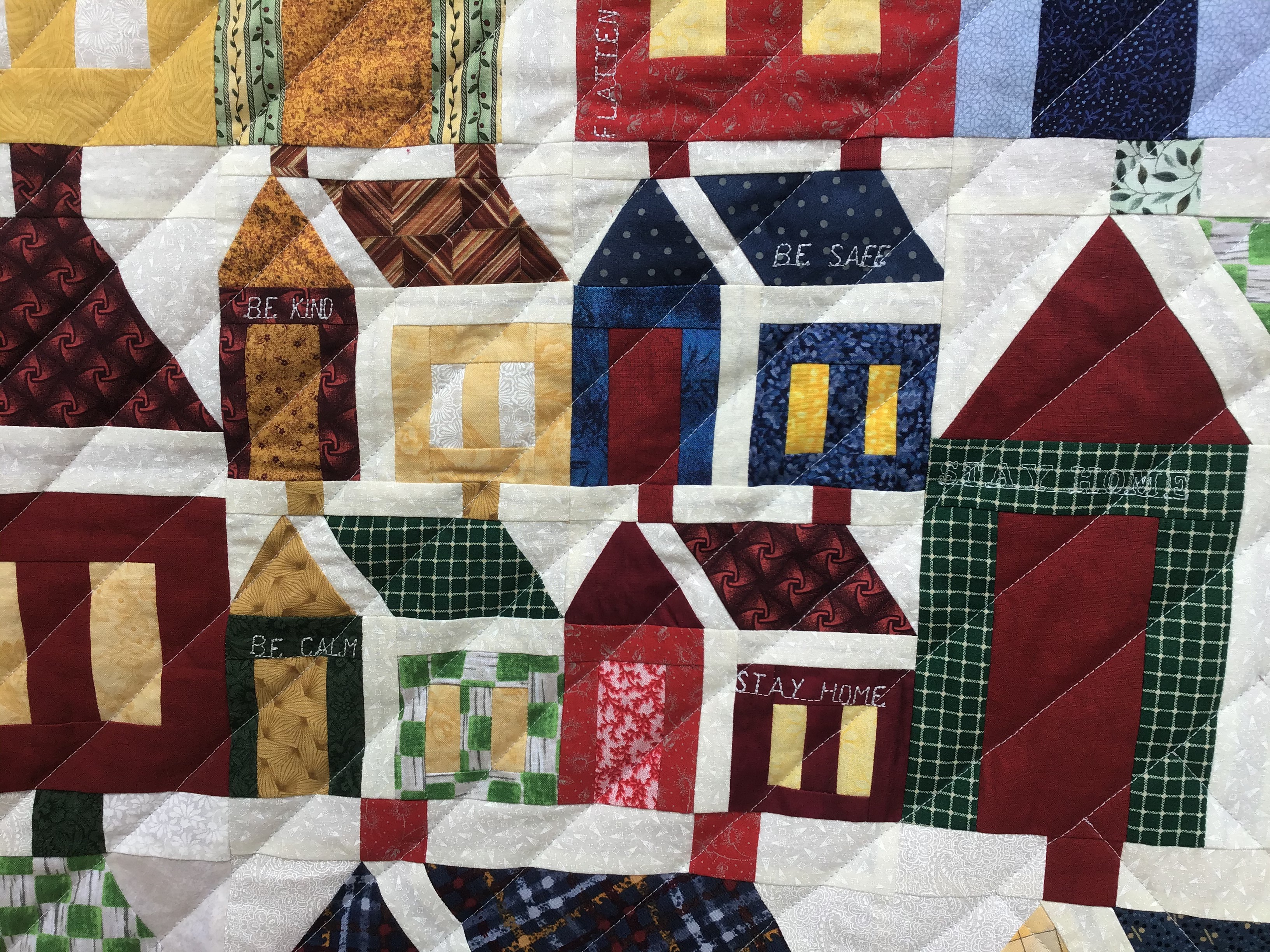 From Donna … Here is my corona virus quilt. The pattern is from a website allpeoplequilt.com. Home for the harvest. I started when we got the order to stay home and I am finishing before the order is lifted. I used all my bits and pieces of fabric and stitched together enough batting to be big enough. I programmed my pfaff to write on some houses … be kind, be calm, be safe, stay home, wash your hands, flatten the curve. I am very pleased with the result. It is for my grandson.