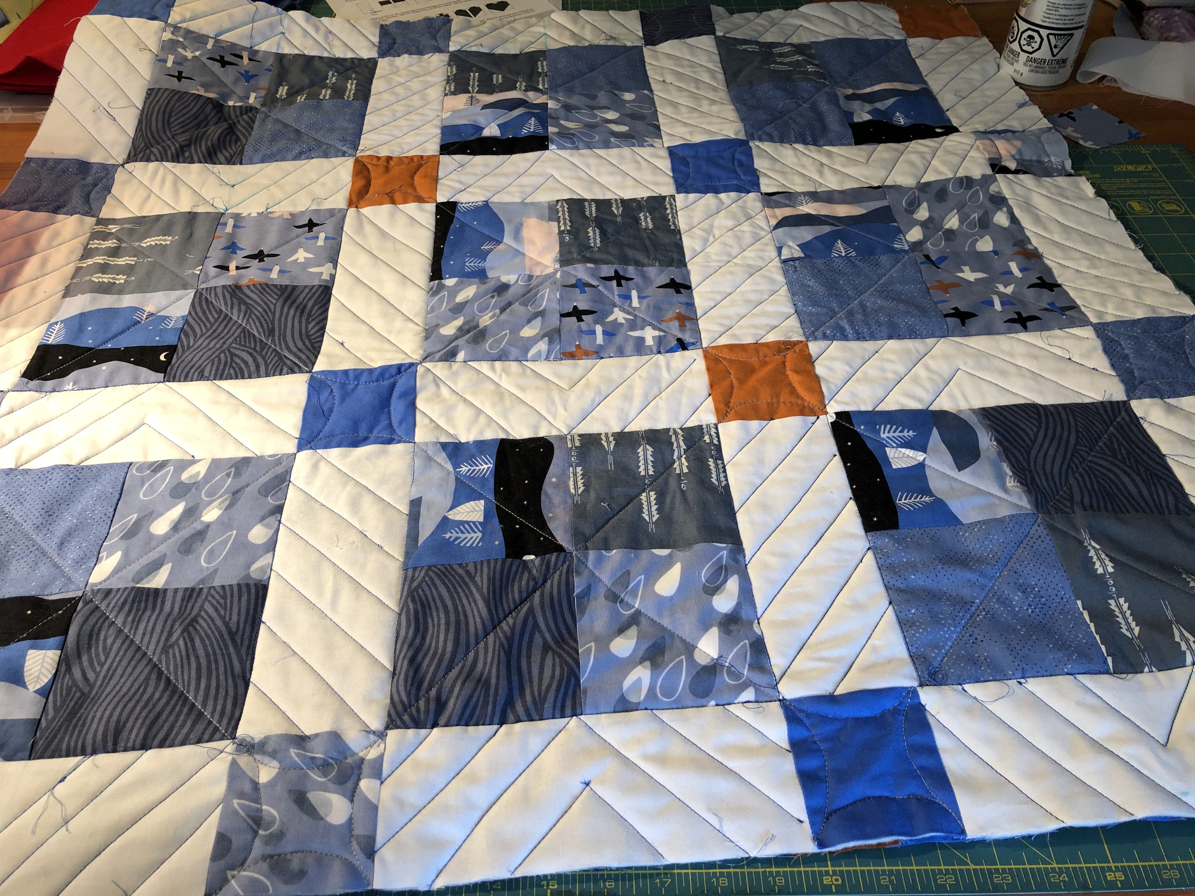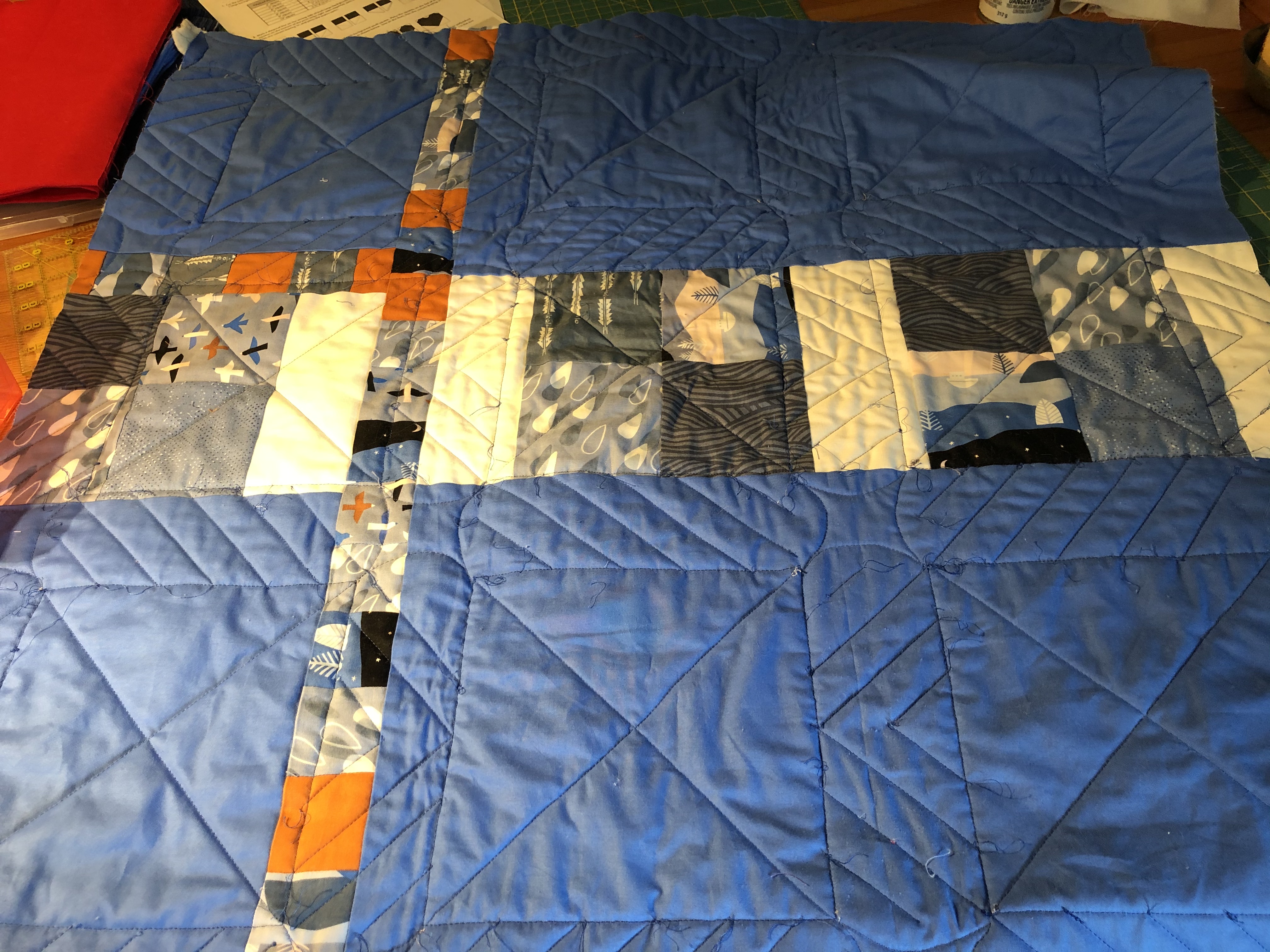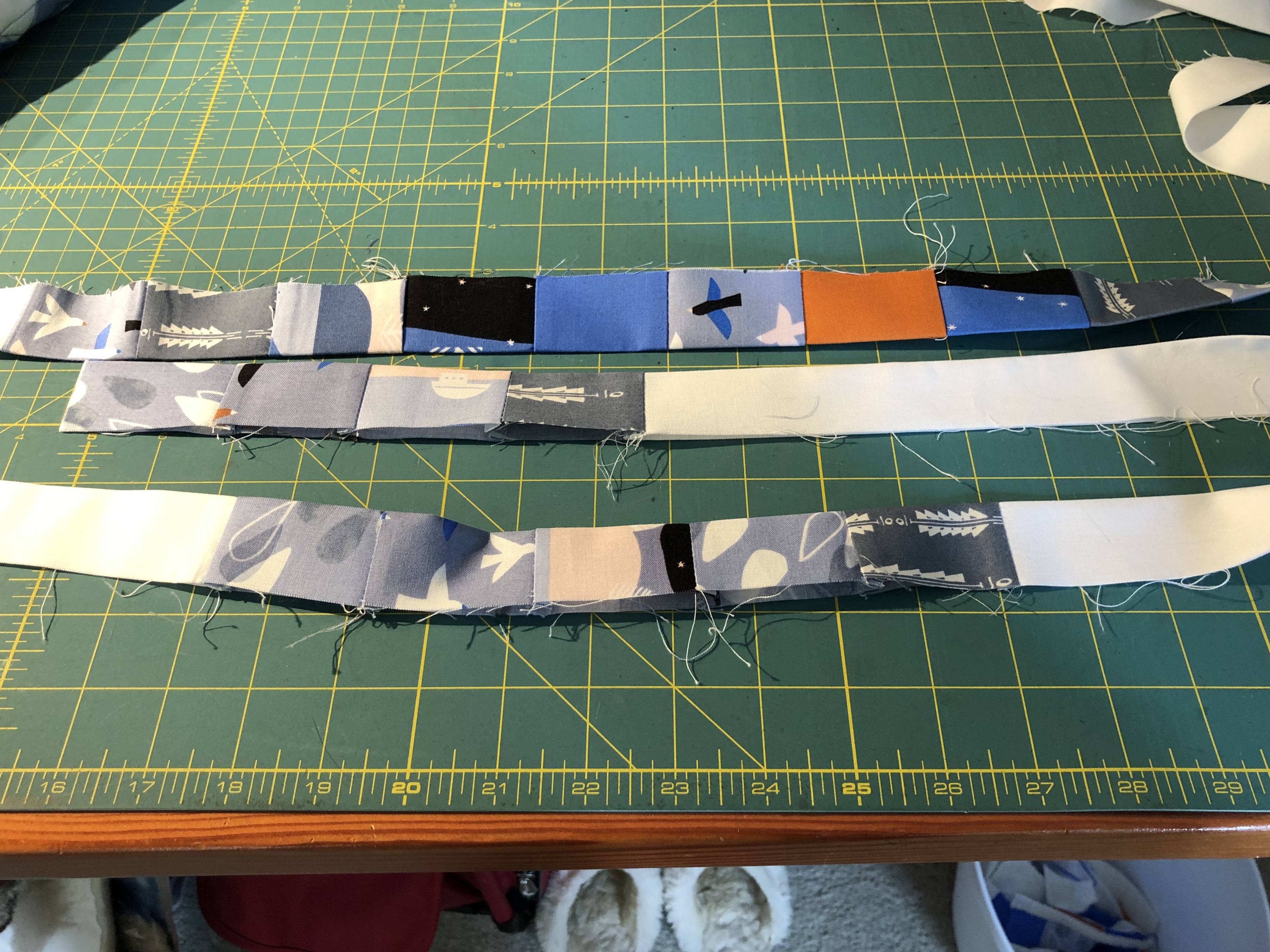- Straight line stitching can still be a challenge. Map out the directions of the lines first. No details will be shown to my fellow guild members, as I messed up.