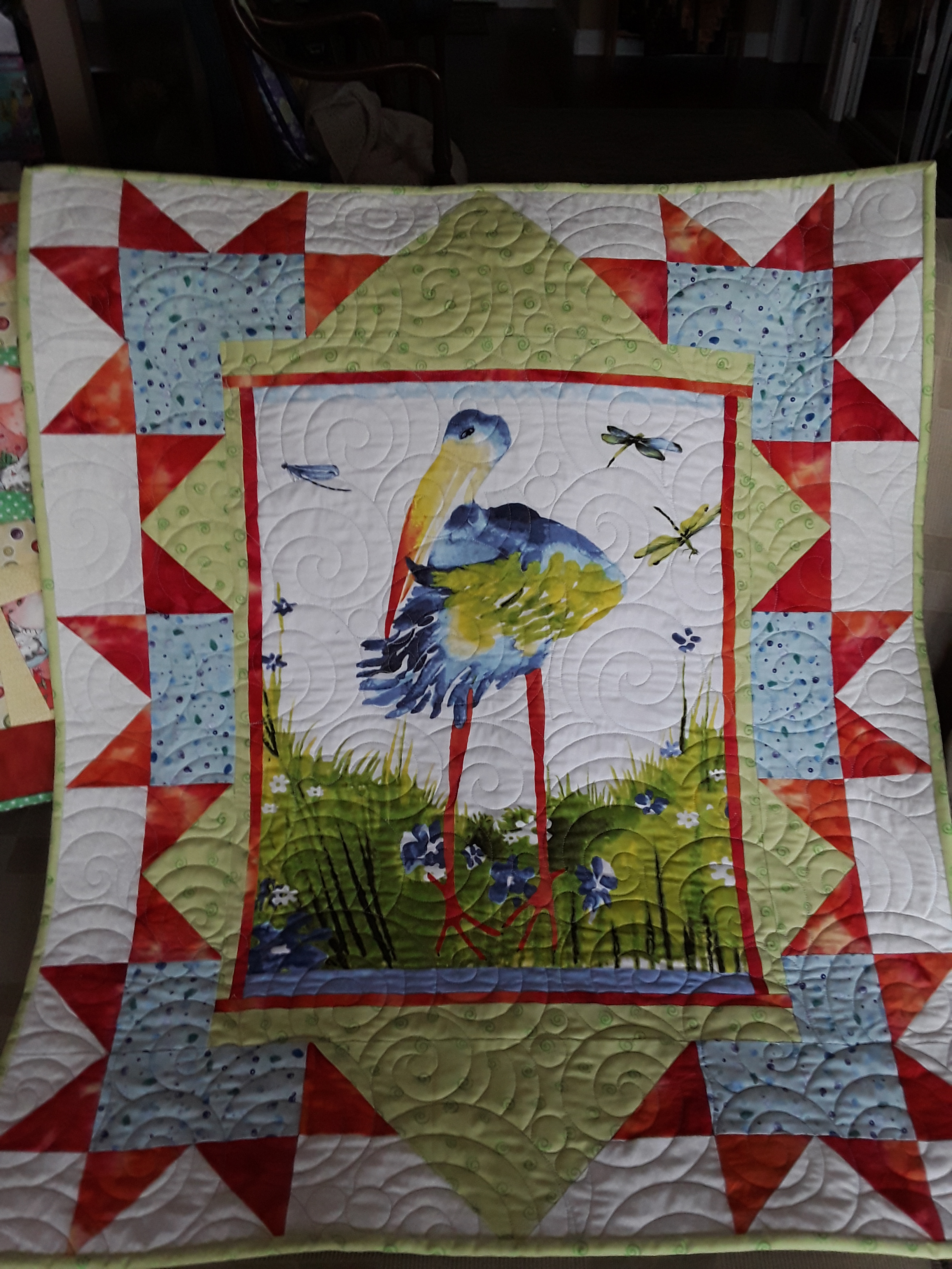 From Moira … Here are a couple of quilts I’ve just finished. The stork one was a panel I bought at Hands Across The Water last September. It was quilted by Wildflower here on the Coast. It is for my granddaughter due in June. The second one is for my granddaughter born prematurely in March and still in hospital. I made this one from my stash and ran out of the button fabric so improvised.
