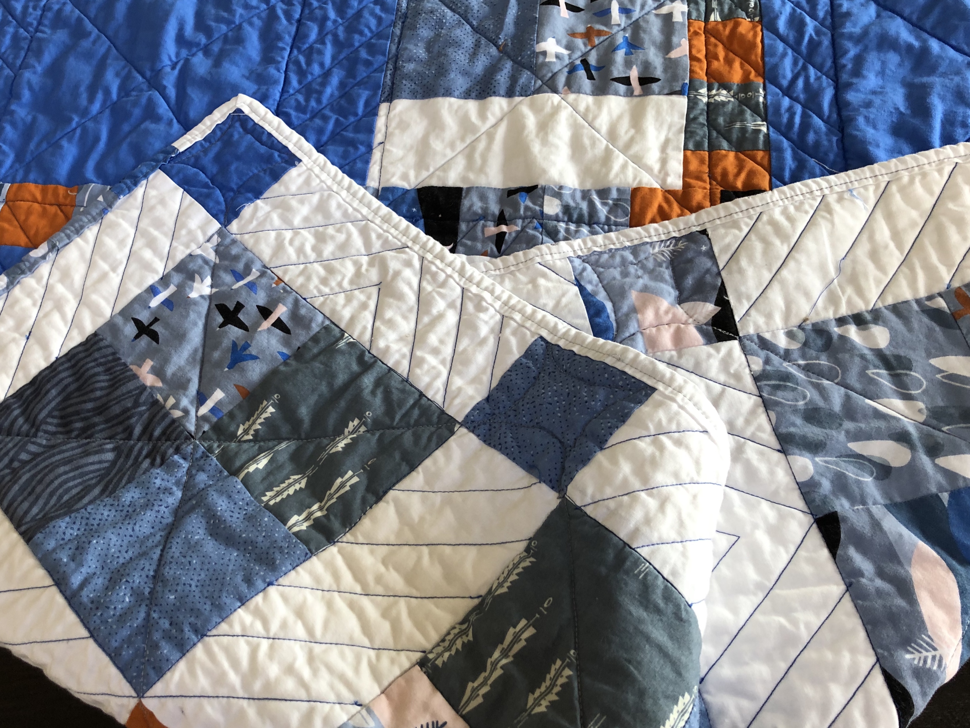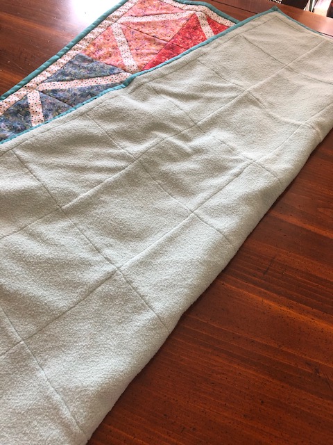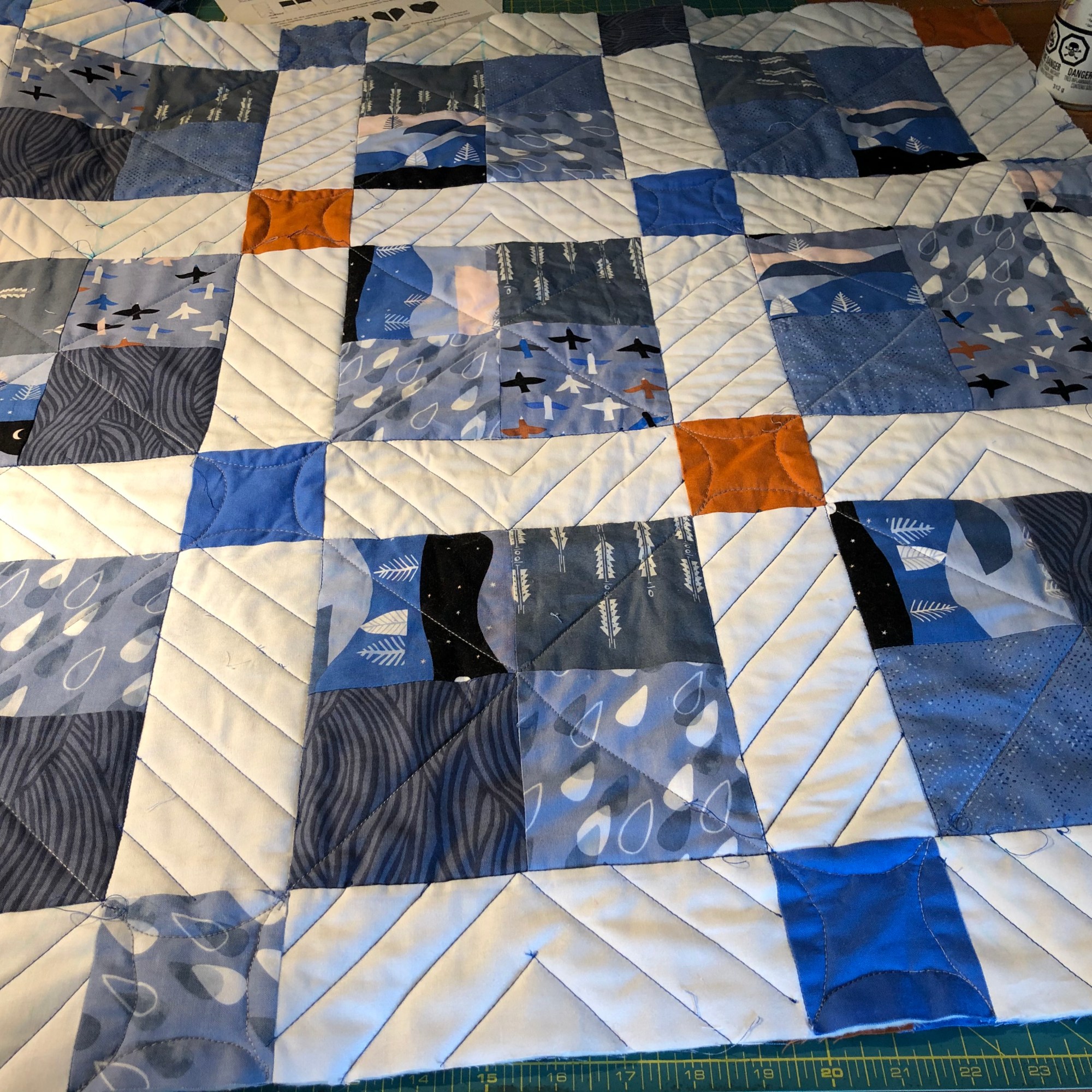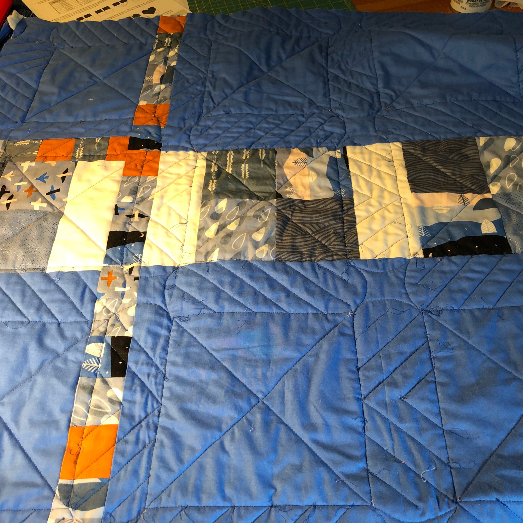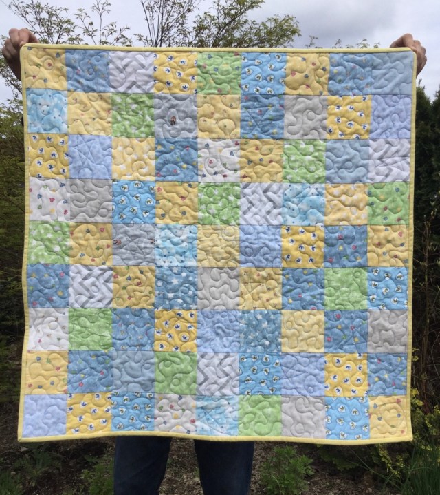In March I finished a quilt made with the leftovers of my daughter’s first quilt. She bought a kit from Thread Bear years ago and still has it. She changed a few of the fabrics so there were enough leftovers to make another quilt top. I brought them back with me and made this quilt which will go to her friend here who is having a baby soon …