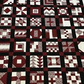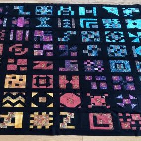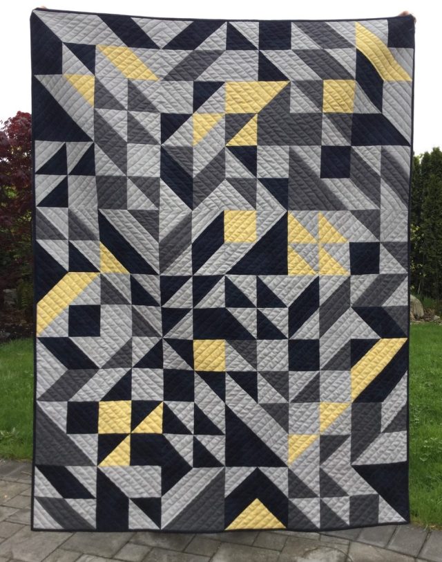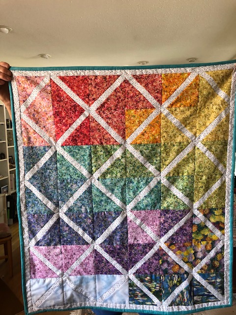 … My second finish is from April. I finished a quilt inspired by the Libs Elliott class I took at CQA in Ottawa last year. “Embrace the Chaos” uses the random placement of six blocks one has chosen from a set of blocks handed out by Libs. Libs has a computer program that places the blocks but she used a bag of numbers and dice for us to place blocks randomly. The quilt is now with my daughter, her husband, and their new baby girl.