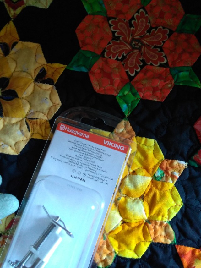 … and now that I’ve received the replacement for the broken free-hand quilting foot, I’m continuing on the hexagon quilt. It’ll take me a long, long time, which is ok as I’ve got plenty of that on my hands.