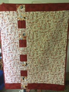 From Chris … I found this “Dog fabric” in my stash so made this Disappearing 9 patch for a friend. Didn’t have enough of the beige background for all of the blocks so some have a white background. Used the last of the small triangles on the back.