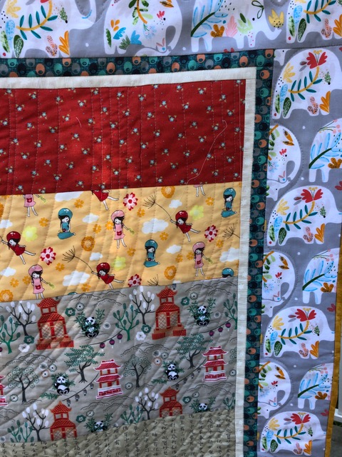 From Linda D … This guilt is almost finished for my friend’s new Granddaughter. The baby’s mother is Japanese so I tried to incorporate Japanese themes. For instance, the little girls holding flowers blowing in the wind and the ones dressed in Kimonos as they travel the world.
