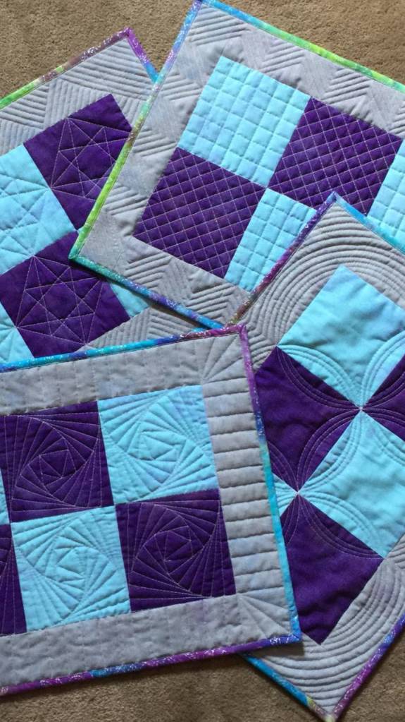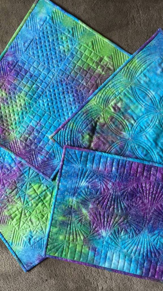 From Kory … Last time I sent a photo of one of my placemats. These are the finished placemats (fronts and backs) and great samples of ruler work. Fun class and rulers from Silly Moon Quilting Co.