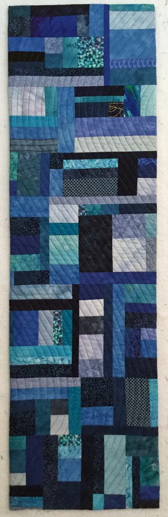 From Marilyn … This runner is made from crumbs found in my box of blue scraps. I started it on the SOSAH Day that had links about crumb quilts.