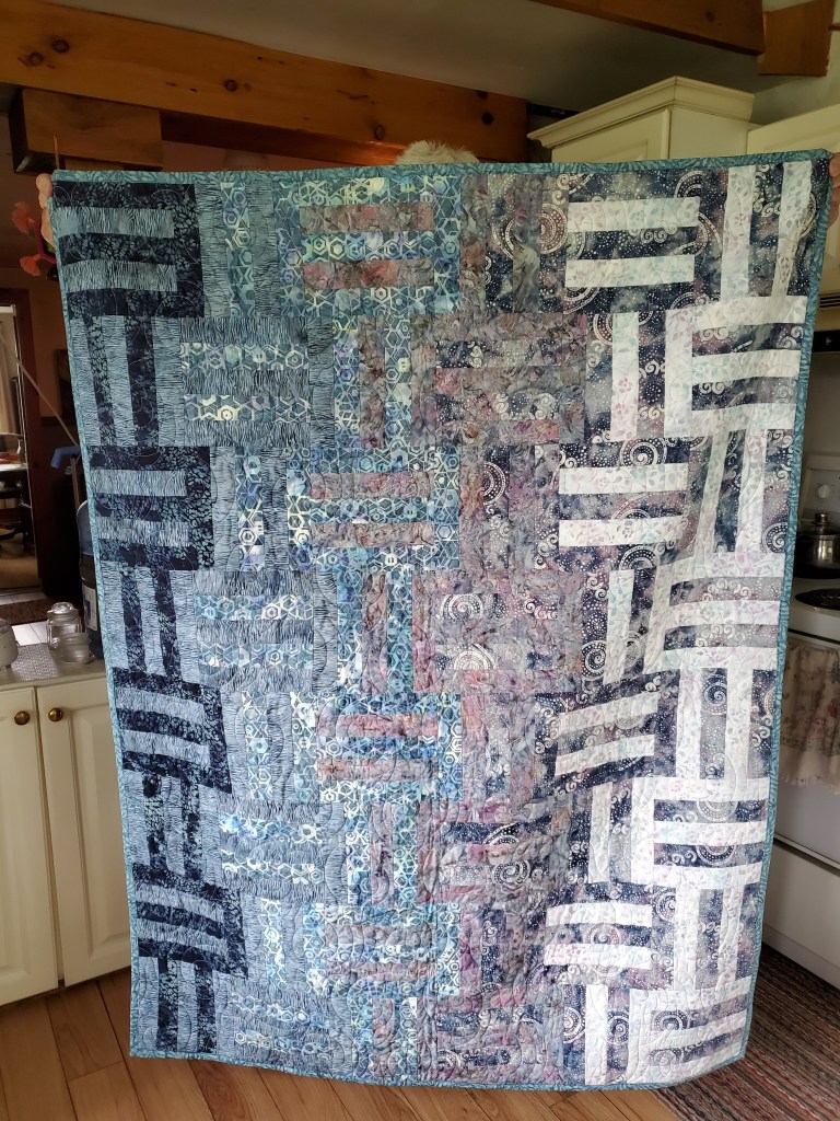 This blue/geometric quilt is a gift for my niece who just turned 40 and lives on a farm so I wanted to have a lot of darker colours. Wendy with Threadtales quilted it for me. I felt it was too large for me to handle …