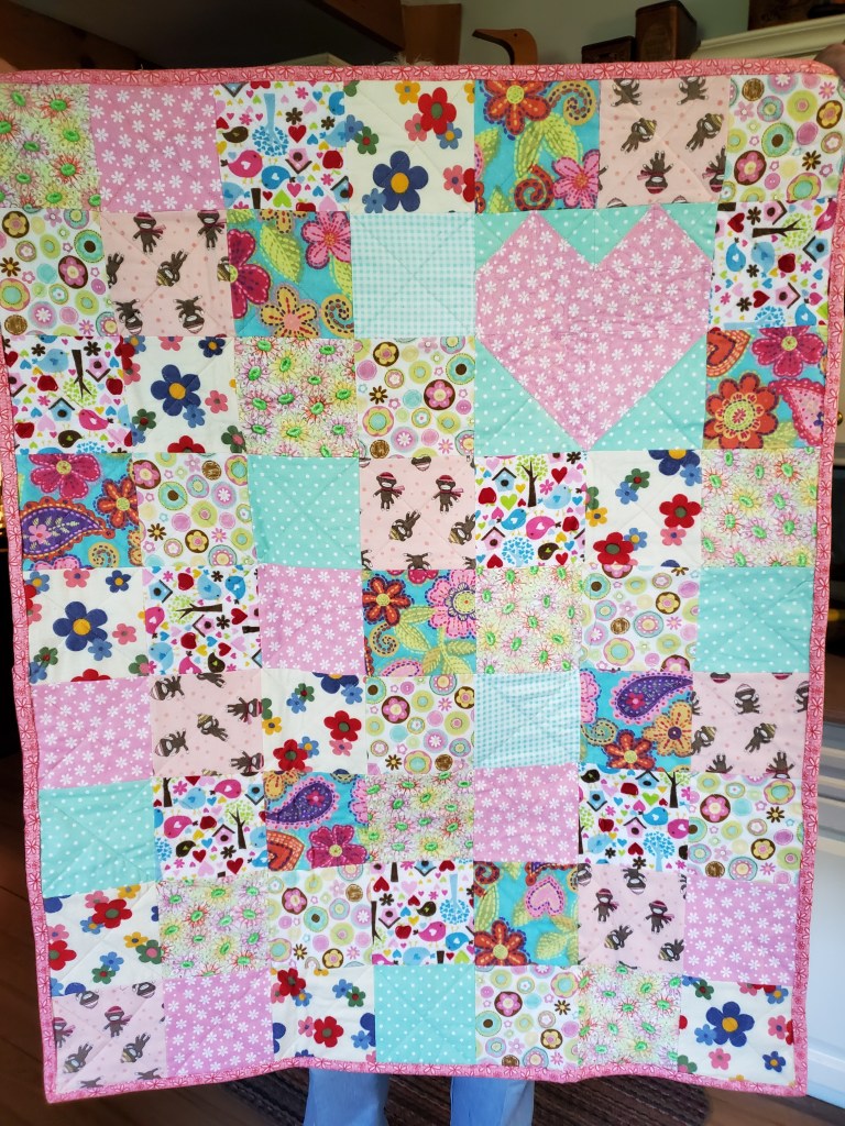 … This pink/blue quilt with the heart is for my nephew and his partner whose second daughter Scarlet arrived recently. The quilt top was made with scraps including some Wendy gave me. I machine quilted this myself as it was not too large to handle.