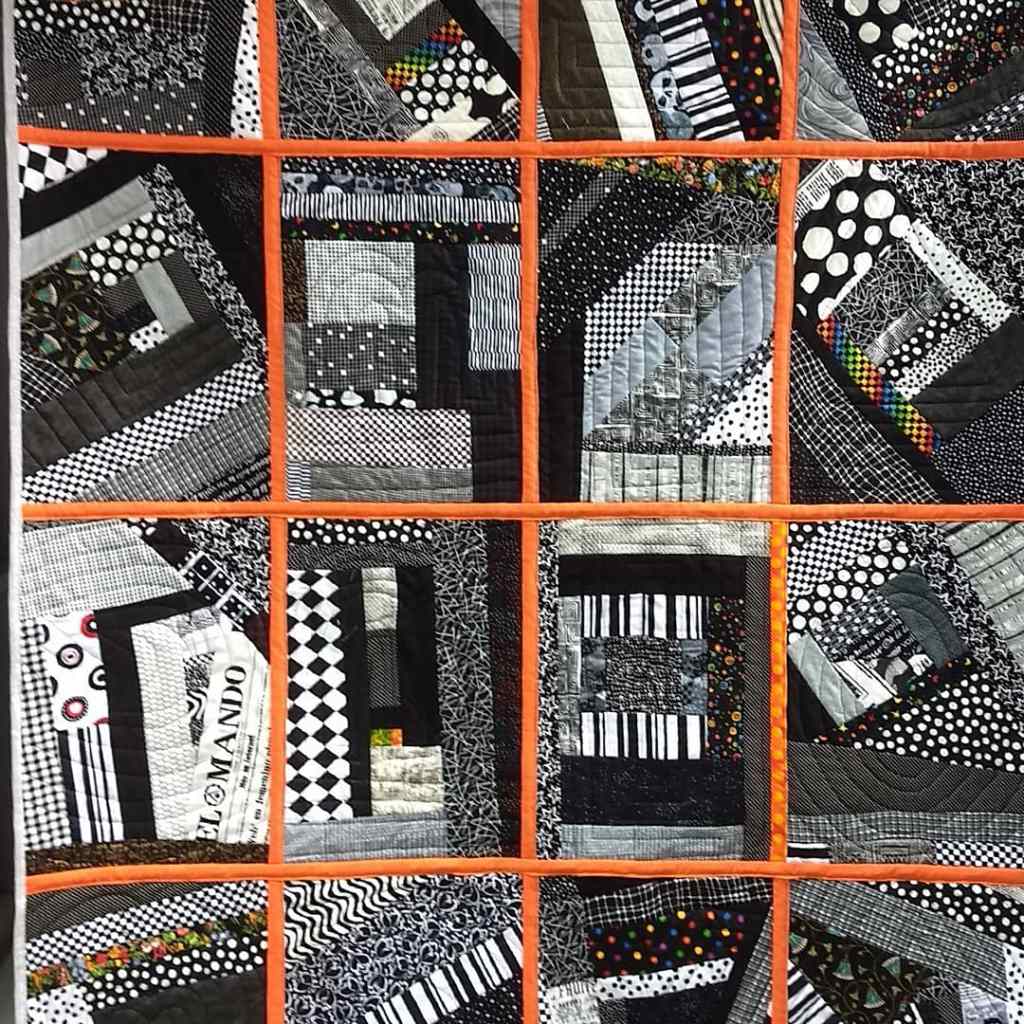 I had done the black and white rectangles when I was making another quilt so my daughter-in-law picked out orange sashings and purple backing. She now has a TV room quilt.