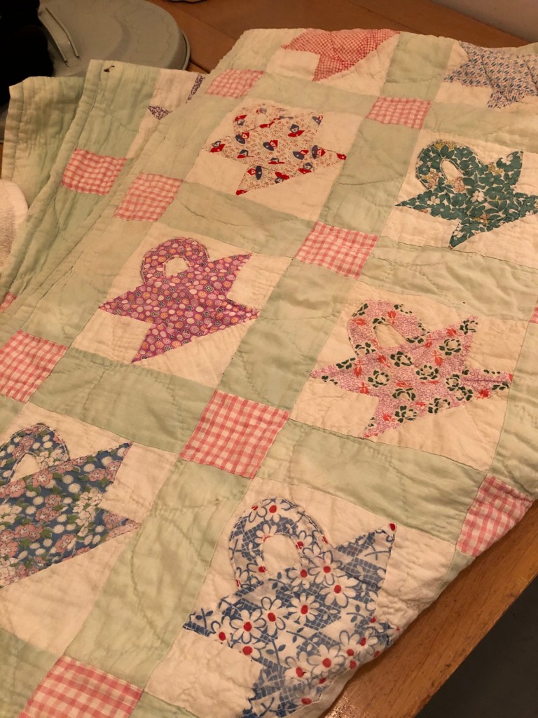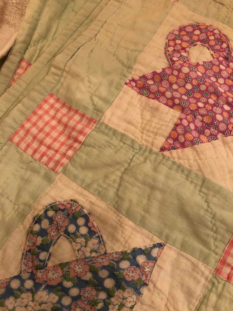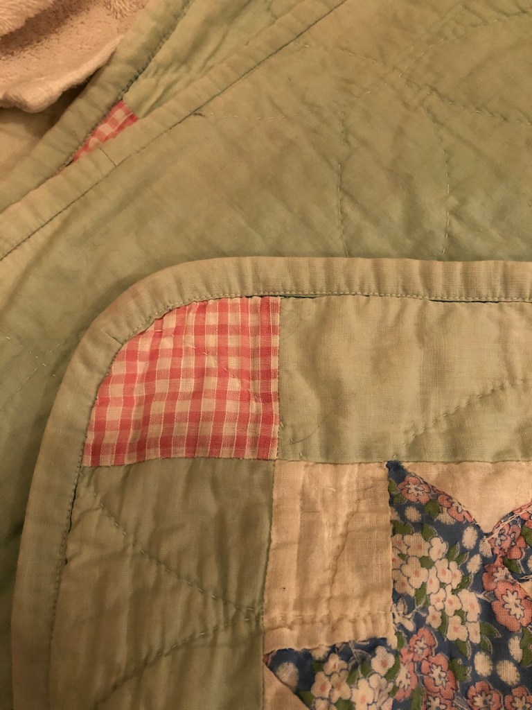 Small detailed hand stitches made from my Grandma’s aprons. The fabric is thin, not very frail. Consistently detailed in every block. Notice the round corner which was the tradition. Maybe Yoskyl can comment on that?
