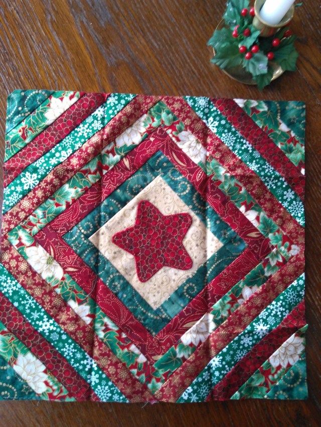 Received by Diane … I received this block from Arlene T and found I had just enough of that thermal batting to make a nice large hot pad for the table centre. Hopefully by Christmas time we may be able to have someone over.