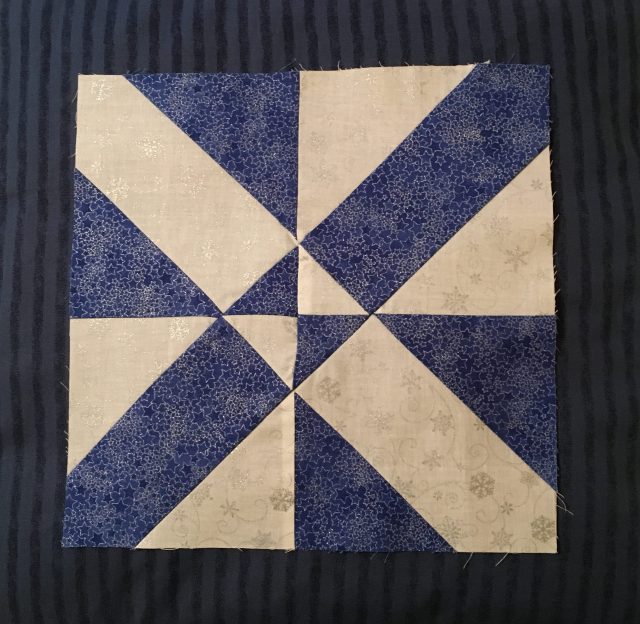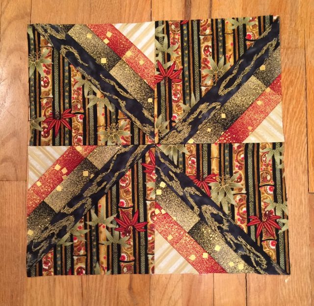 Received by Judy S … Thank you to Chris for sending me this block and the pattern for making it. It is a disappearing four-patch, cut on the diagonal. It is sitting on a pillow to show it off, but it will be part of its own pillow!