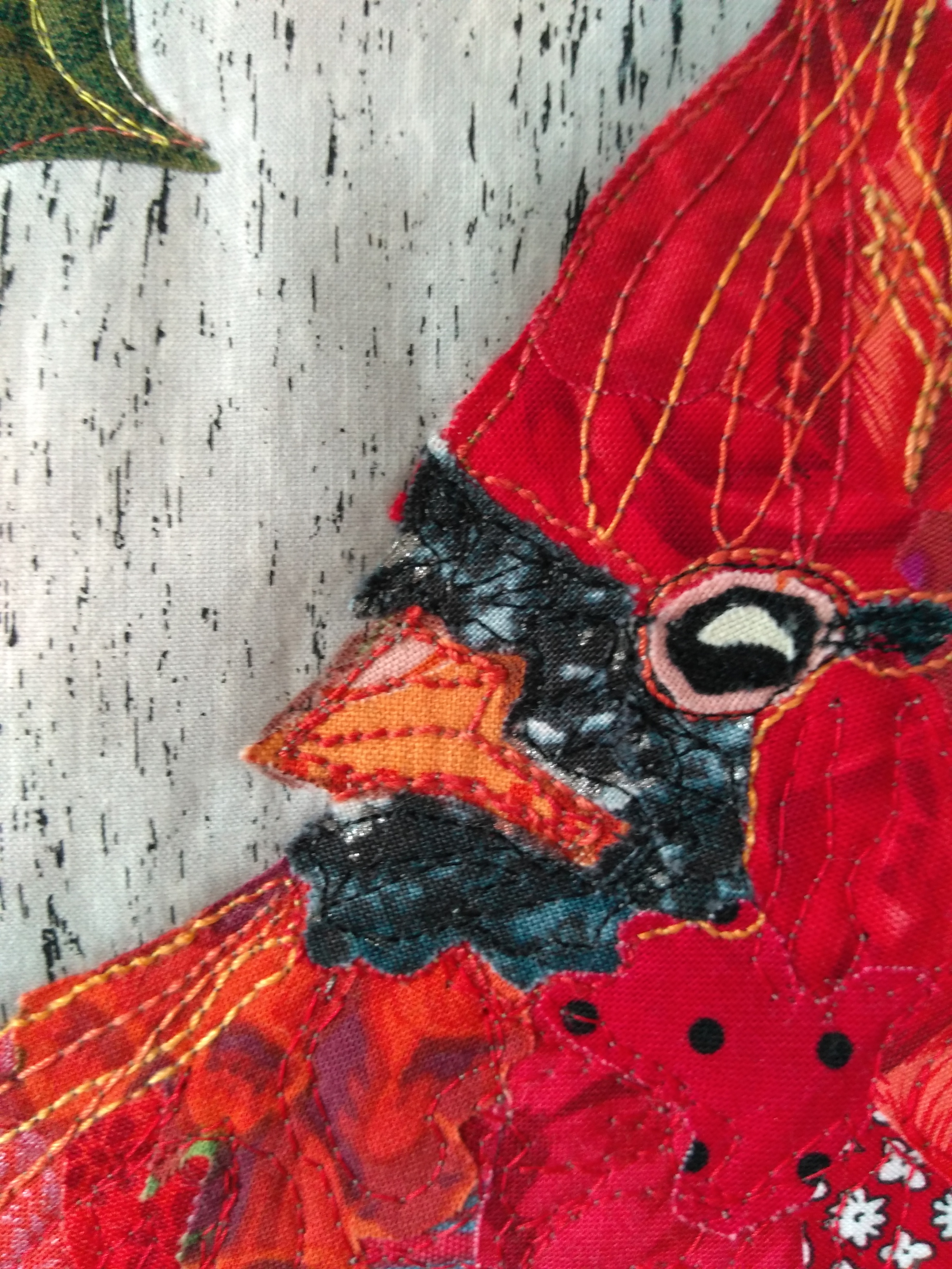 From Anne W … Here’s a cardinal that I finally finished (except labelling not done yet) from taking part in a 1 hour applique webinar with Emily Taylor, a quilter in the US. I also painted/drew in a bit of shading and details.