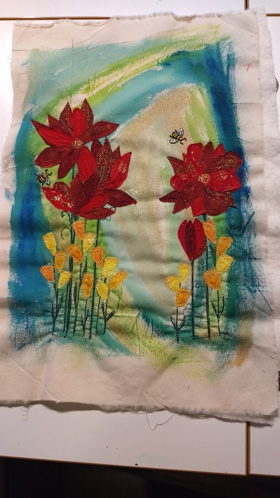Here’s another one of my scrap thread painting pieces. I had cleaned my fabric paint brushes on this piece of muslin and decided to use it as the backing for this piece.