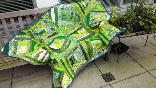 Green 16 inch square scraps done on batting during the past 8 months and then quilted with their backings this week. Put together as a quilt as you go.