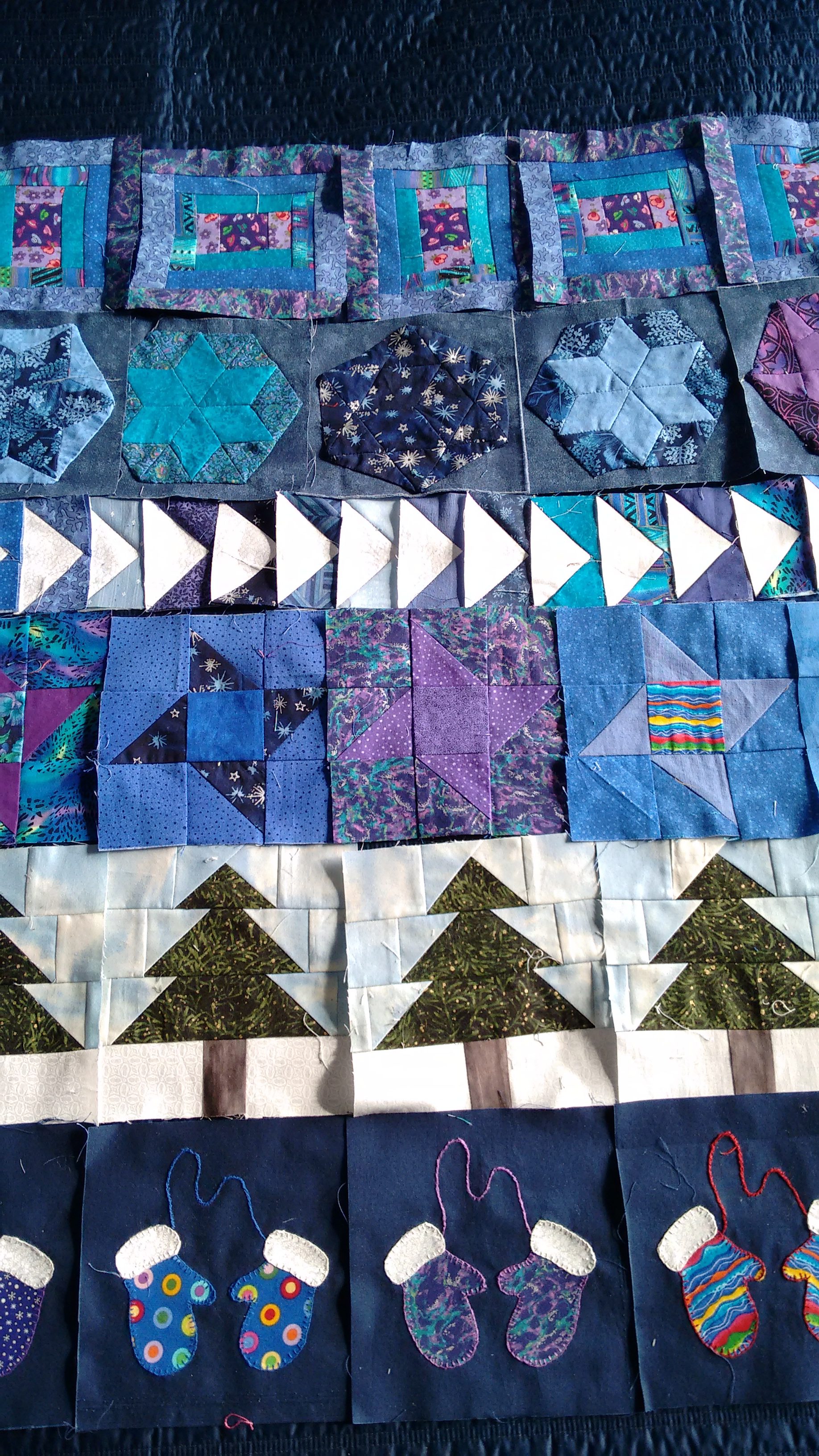 From Eleanor … Someone asked if anyone was doing the CQA block of the month. This is the first 6 rows. Not sewn together yet. Great way to use scraps.