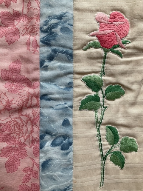 I hand embroidered the roses on to fine cotton before being applied….many years ago when my eyes were better, and my hands were steadier!