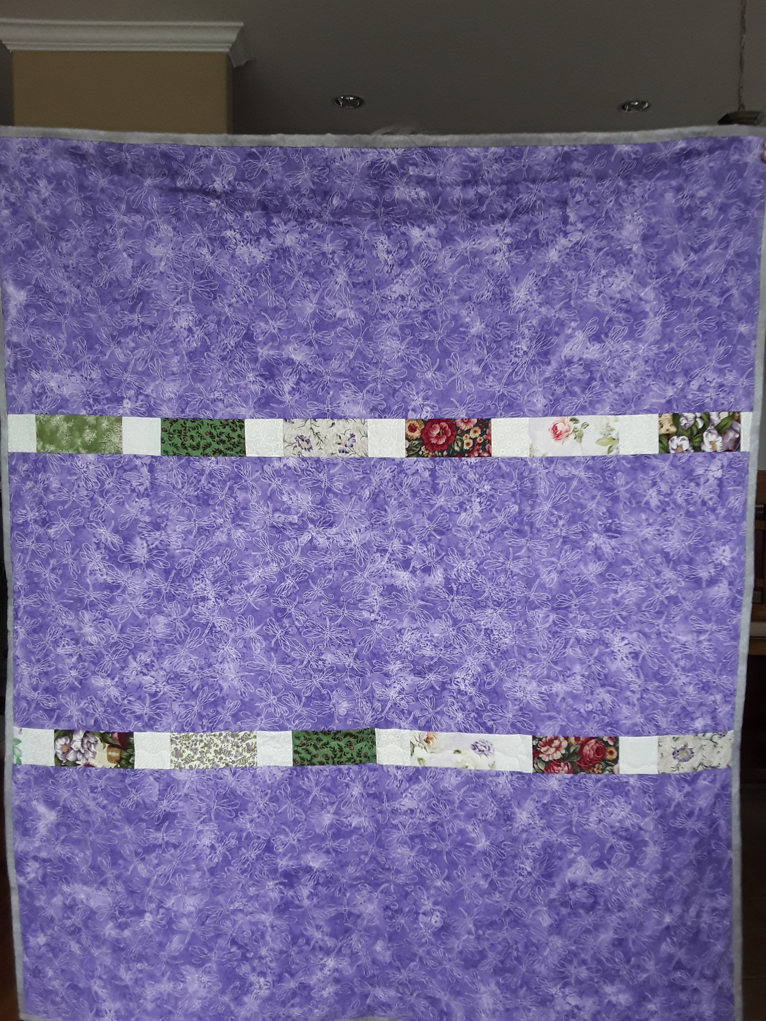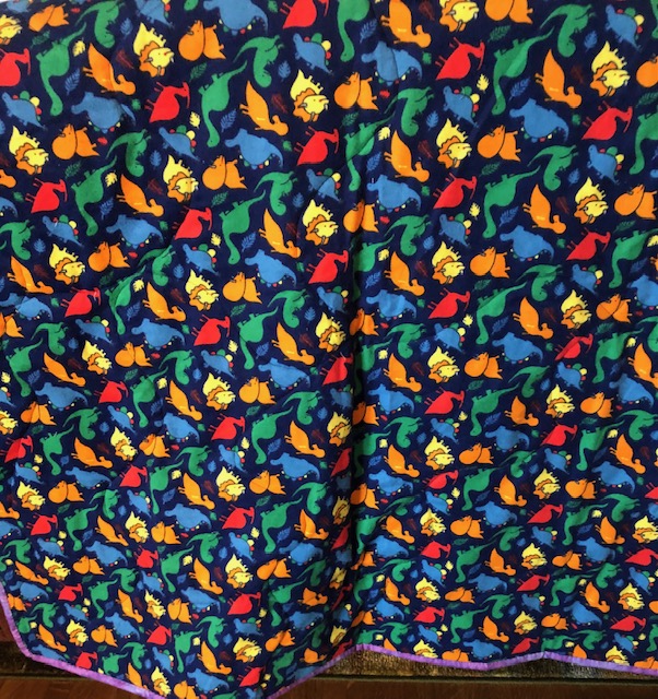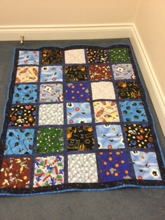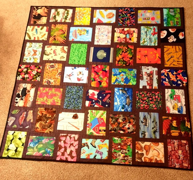 The I Spy Alzheimer’s quilt is finally done. A number of members generously contributed some pieces of fabulous material for the project.