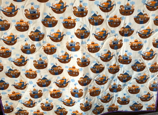 From Sharon R … Another quick baby quilt with tiny Noah’s Arks and with flannelette animal fabric on the back.