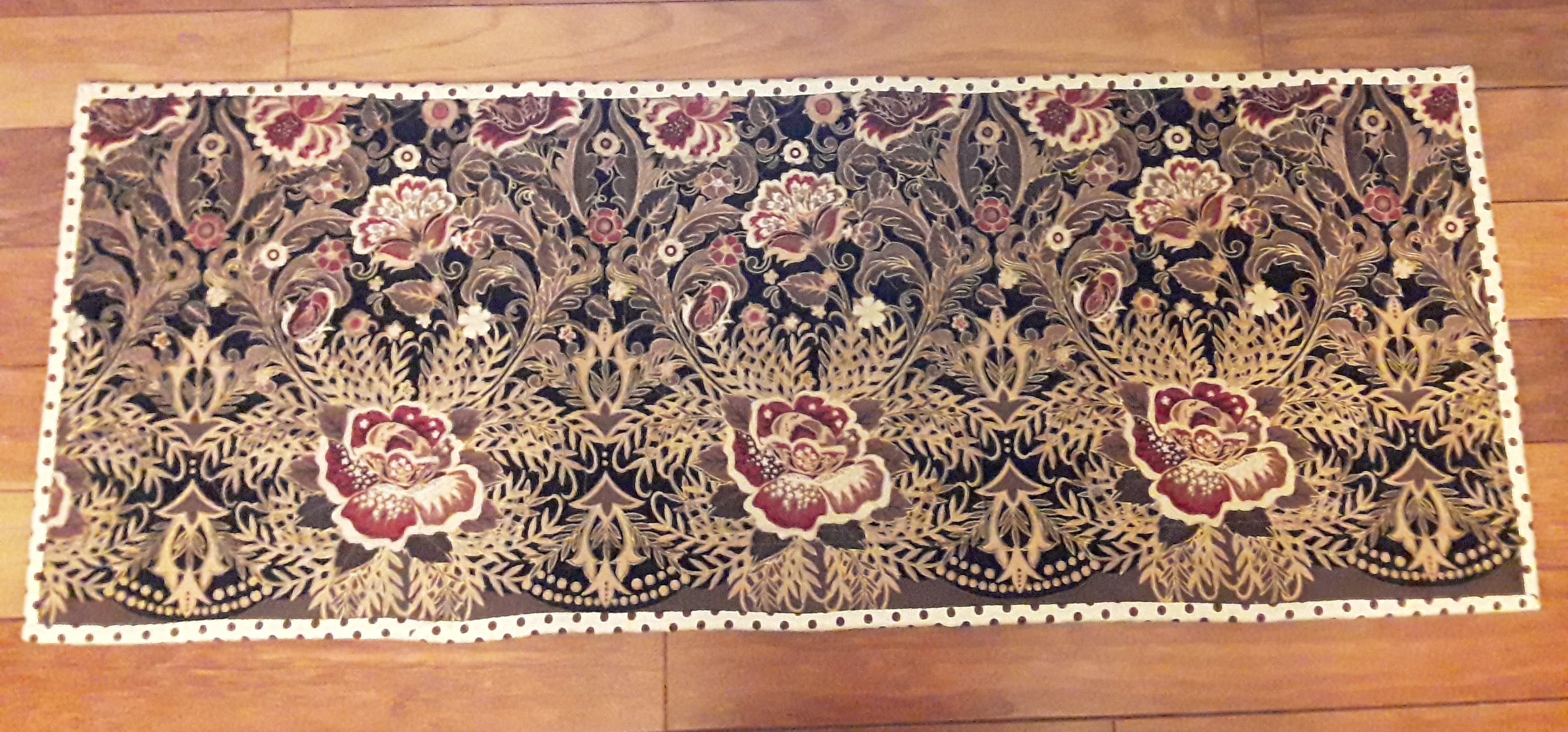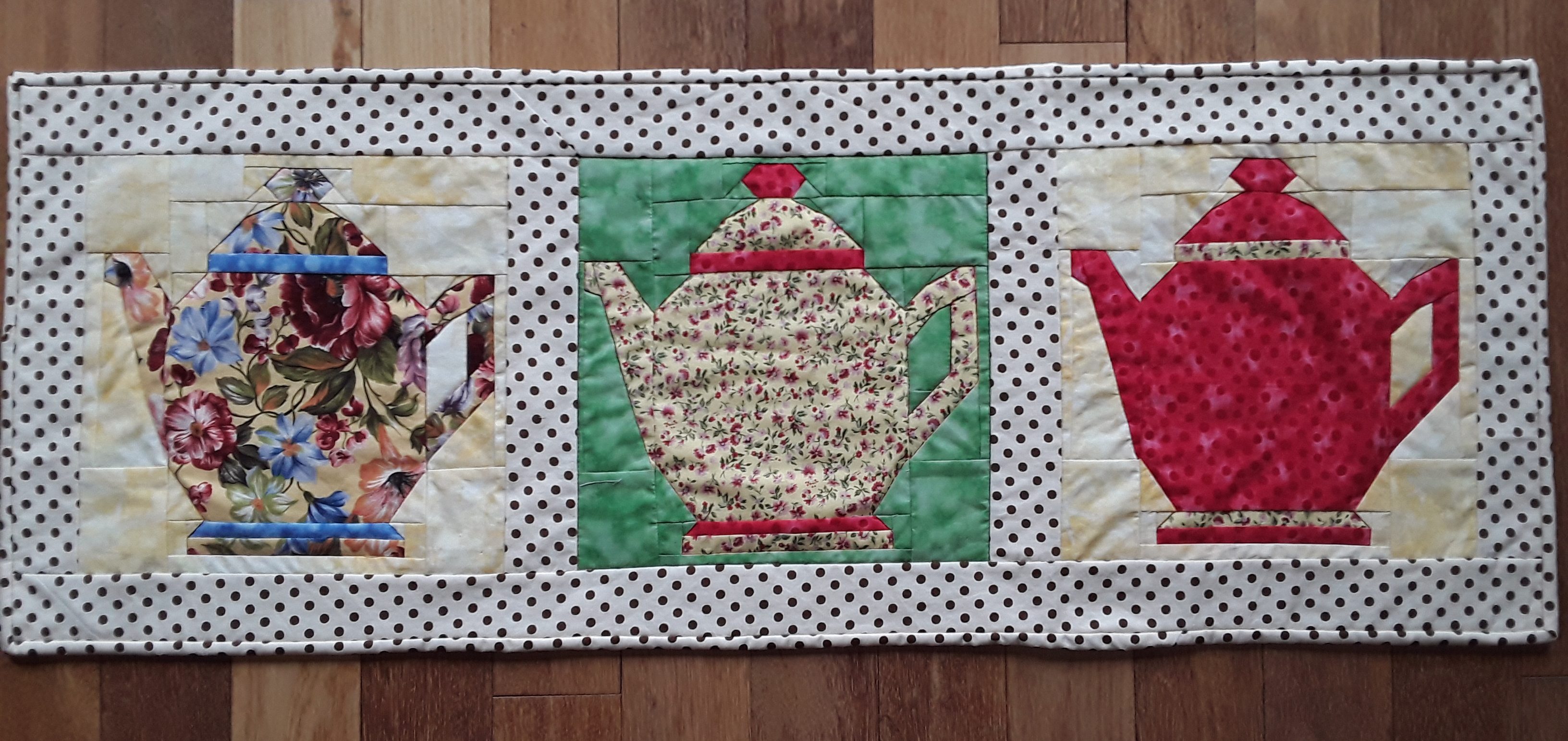 From Moira … Here is a table runner I just completed. I downloaded the paper piecing pattern for the teapot from the internet and used fabric from my stash (the stash is not going down very much!).