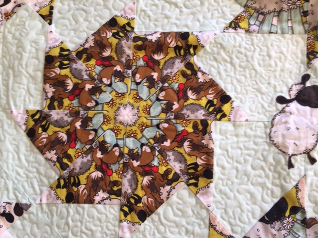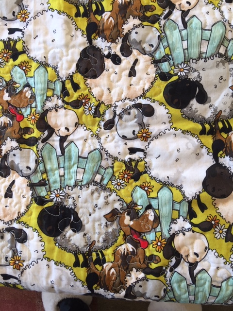 Her pattern used 4 1/2 inch blocks, but as I had larger pictures (lion, tiger leopard, iguana) that I didn’t want to cut into too much, my squares are 5 1/2 inch. It took sharing of fabric and rummaging through the scrap box so most squares are of animals of some sort. Roan, age 2, loves the quilt.