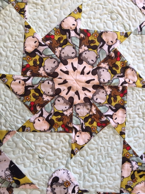What is a Stack and Whack quilt? Rectangular pieces of fabric with nearly identical motifs are stacked and cut and then arranged to create a kaleidoscope effect. For more about the method, here’s an online tutorial that has a lot of information – Stack and Whack Tutorial for Beginners, from Smoky Bear Creek Retreats in Montana, USA.