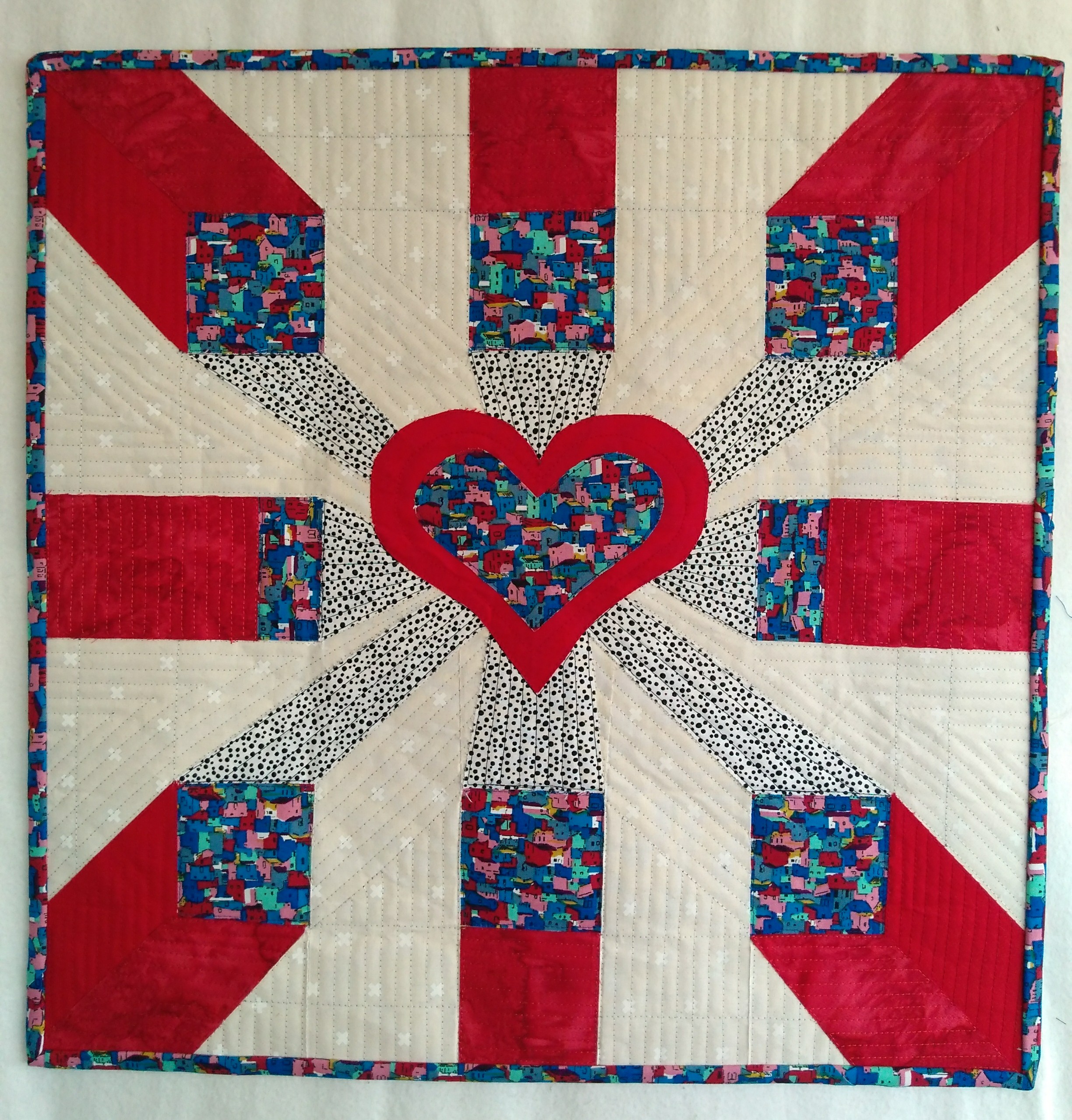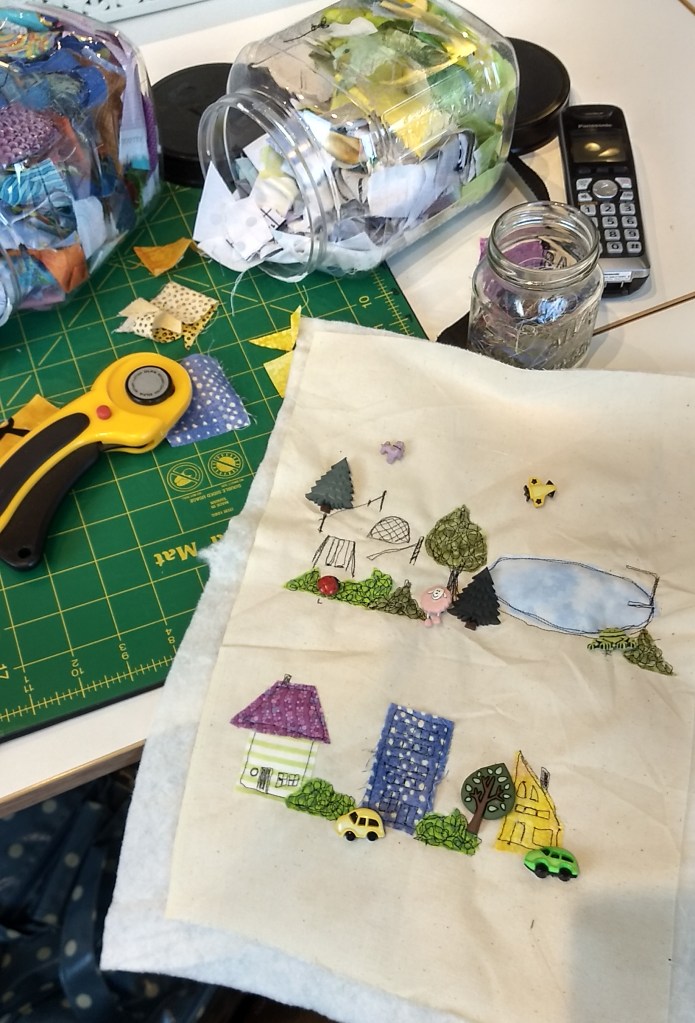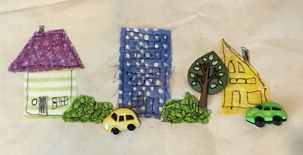 As the theme was friendship, I used the dotted fabric to represent the good energy flowing between all my family and friends houses (the house fabric) through all our electronic devices, email, WhatsApp, Zoom etc.,as we’ve been staying in touch.