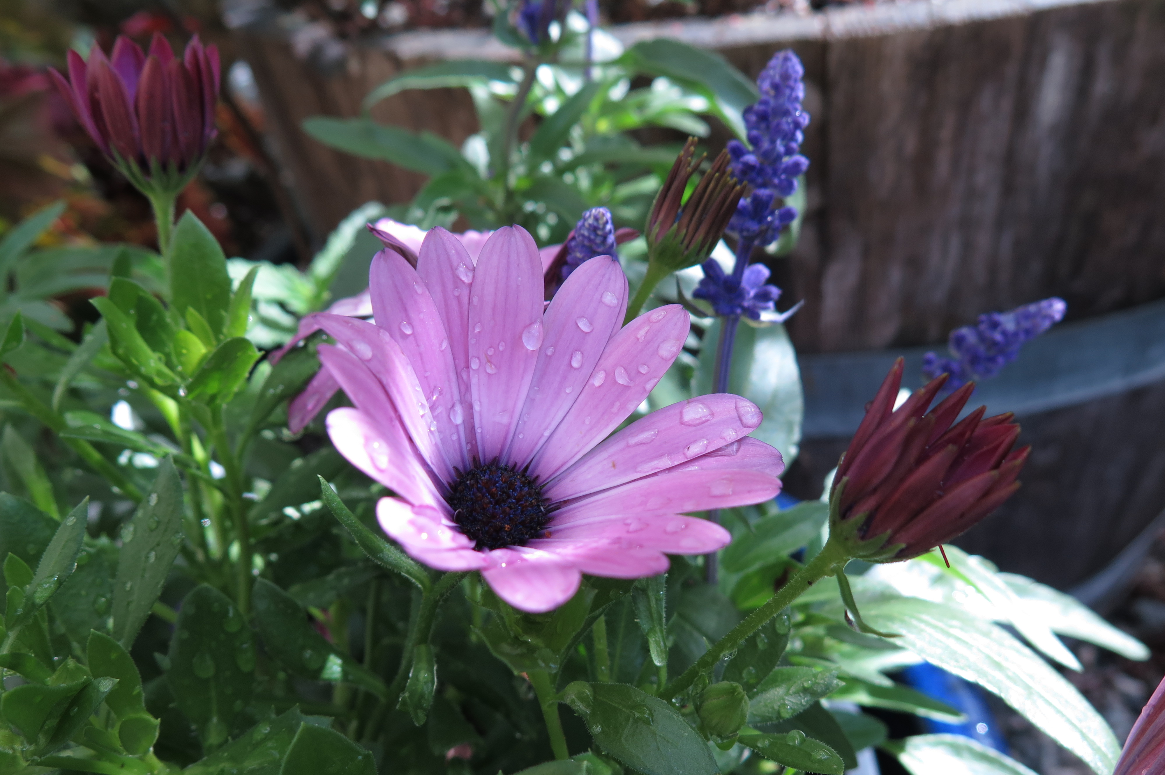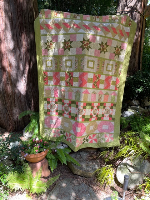 From Glennis … Spring “covid” quilt. 2020 CQA row by row quilt. Stash buster sort of!!!! Quilted by Wendy Margerm. I used a a wide back cotton on the back. (What a lovely setting for this photograph. Ed.)
