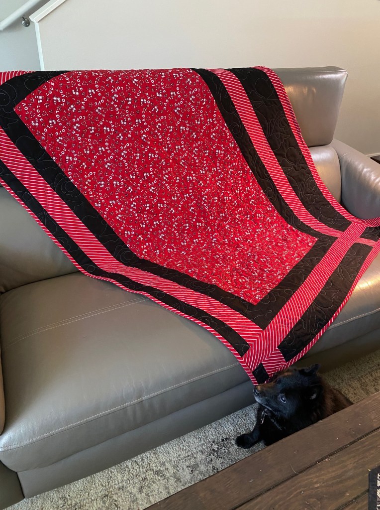 The backing started with a favourite panel of red and white material with “love”and ❤️‘S. I knew I wanted the red and white stripes for the binding, so I incorporated that on the back as well.