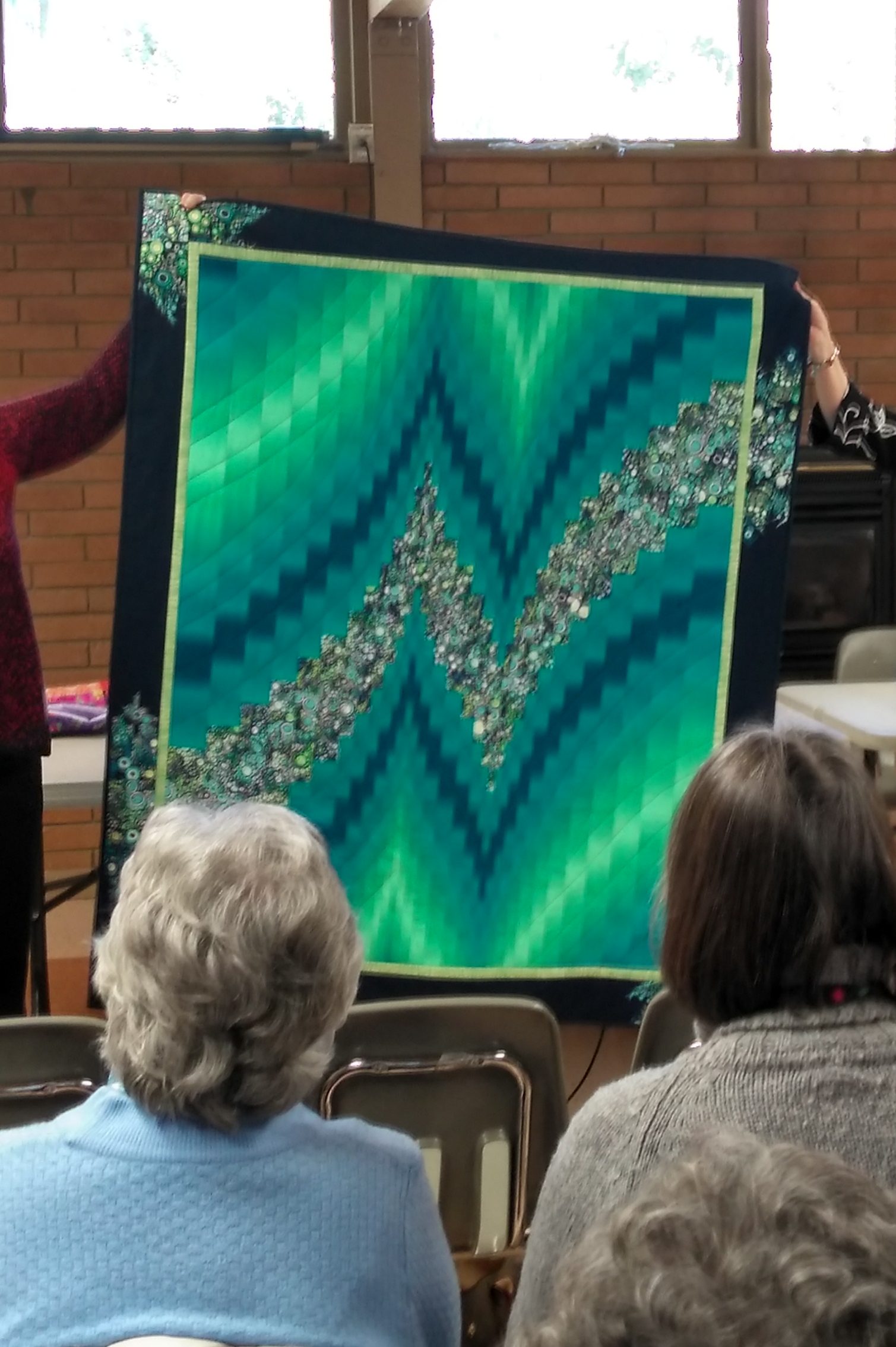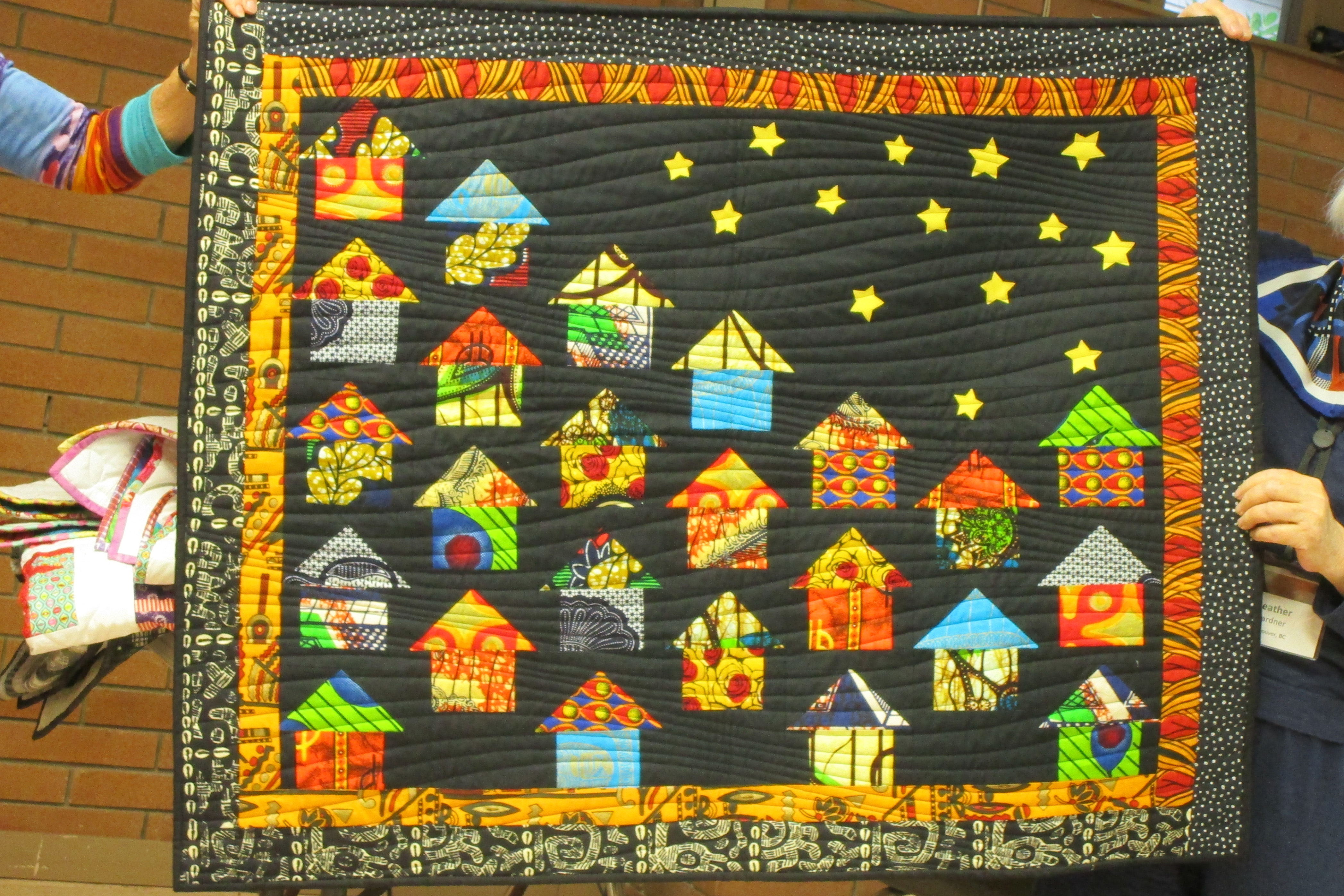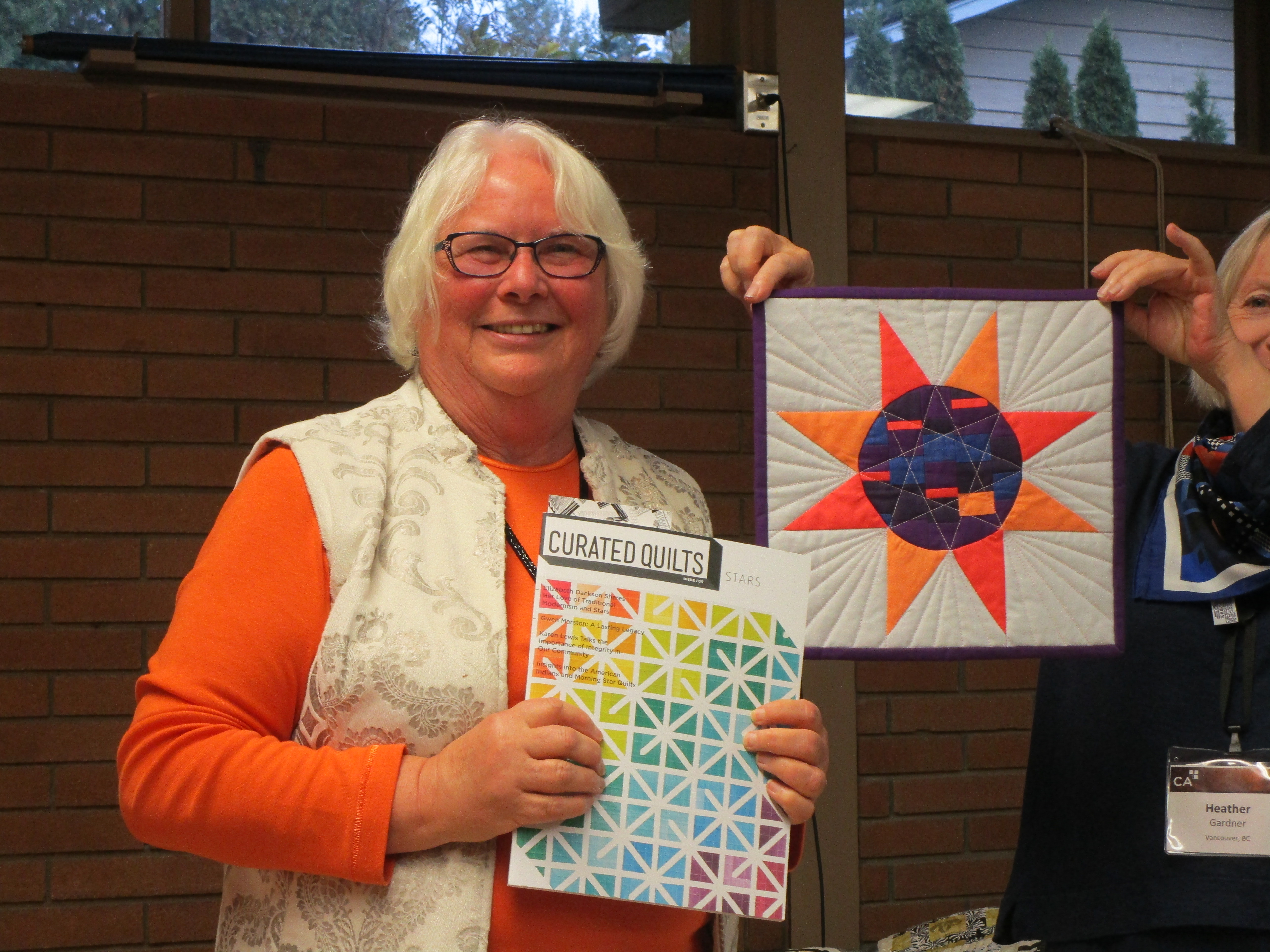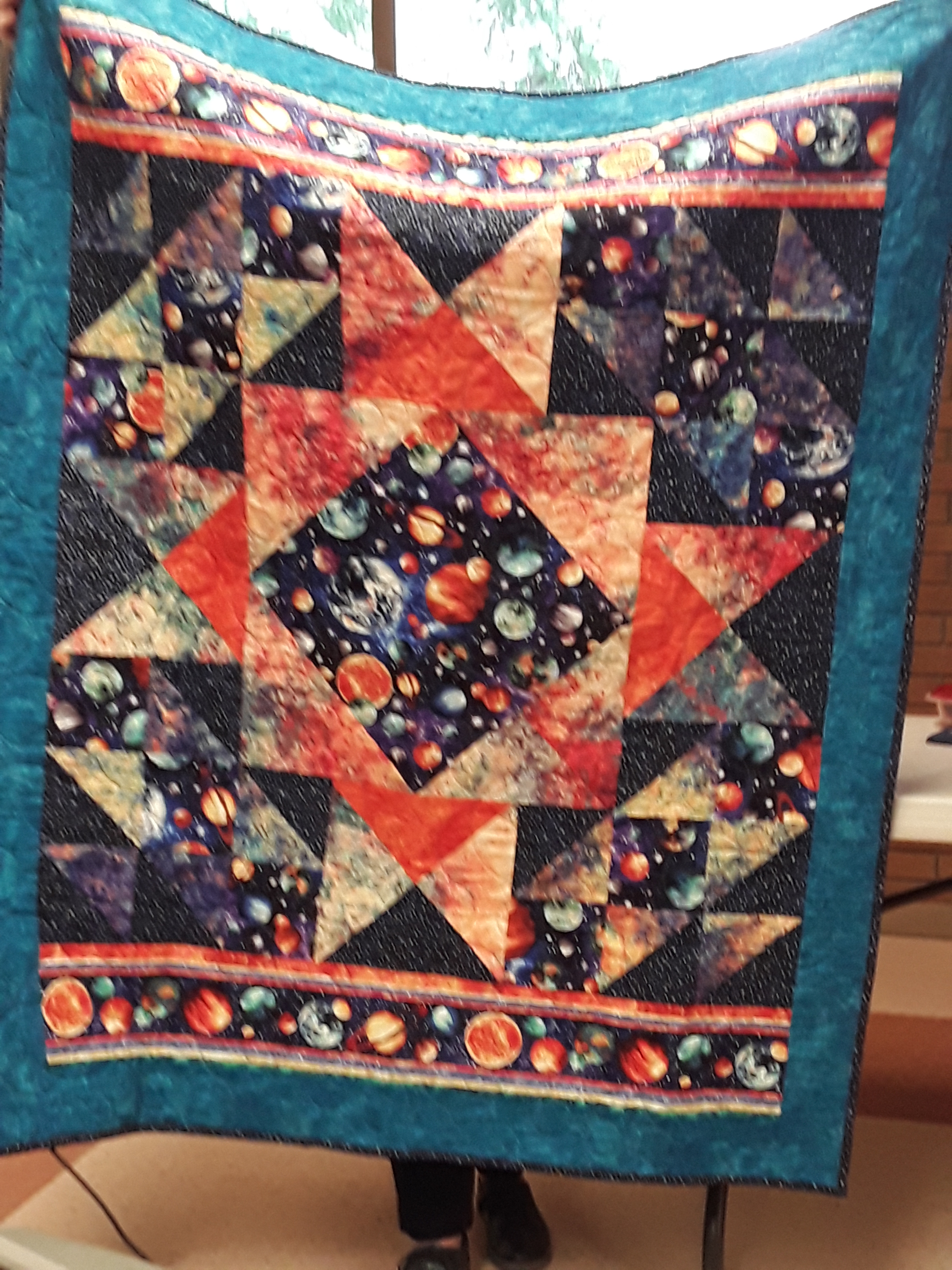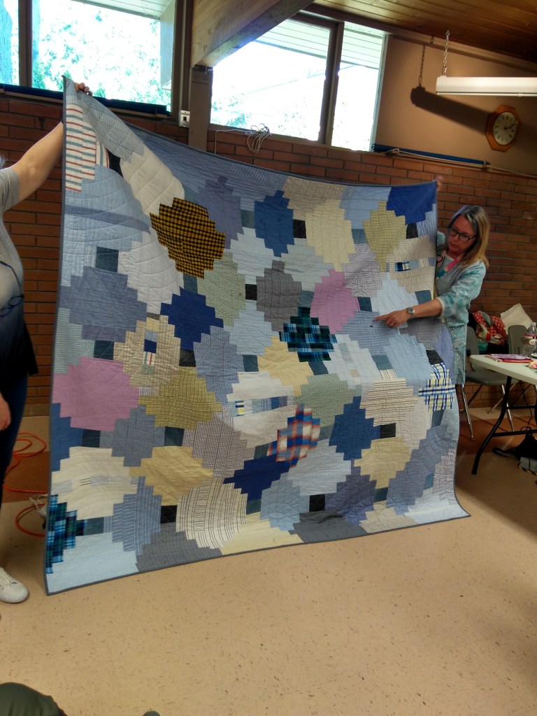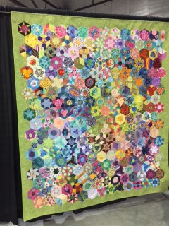 Wendy W sent along these pictures from the recent Boundary Bay Quilters’ Guild show in Tsawwassen, BC. The “hexi” quilt was made by Dougal Walker, who taught the “Wonky Star” workshop for our guild in 2018.