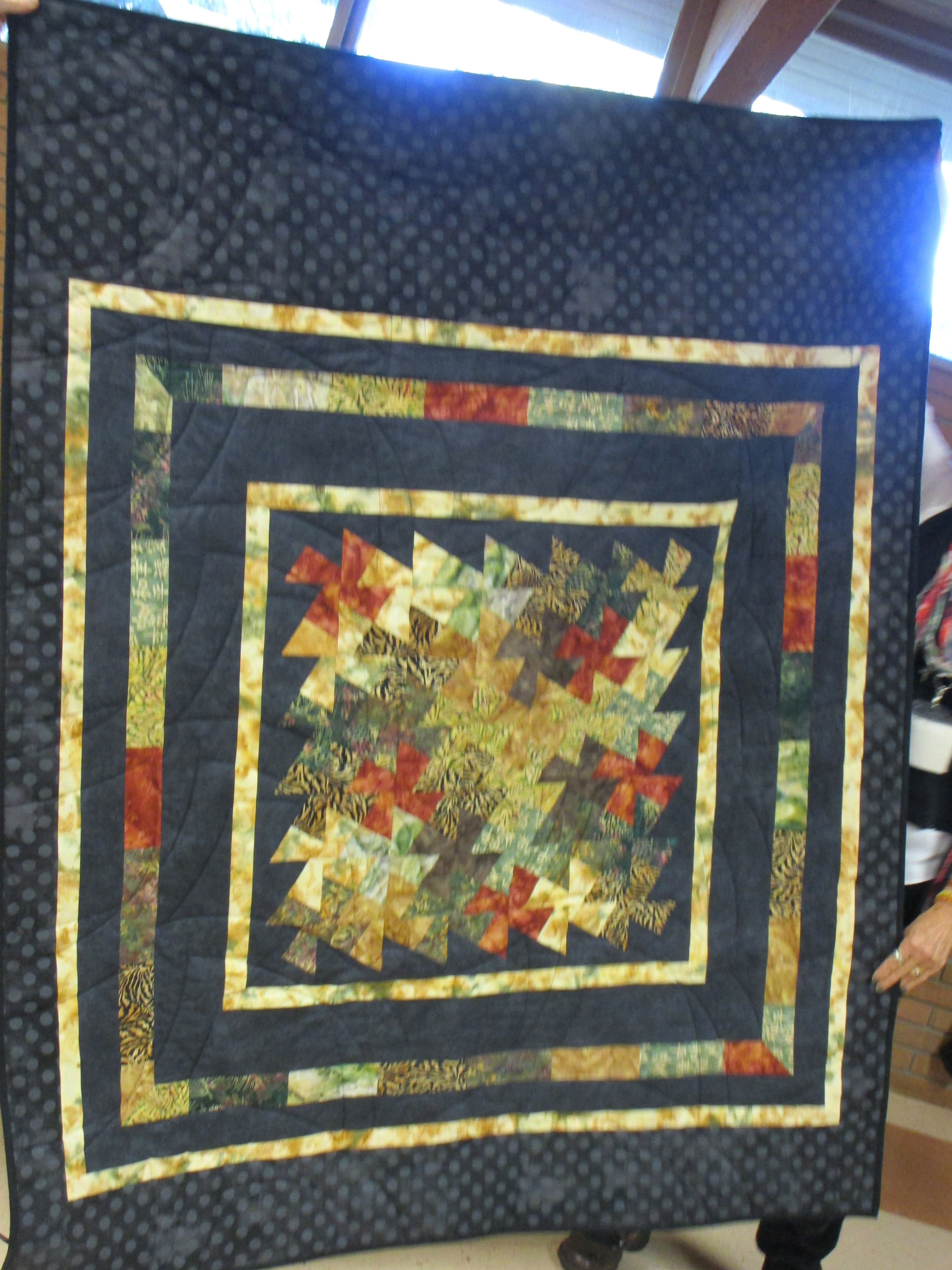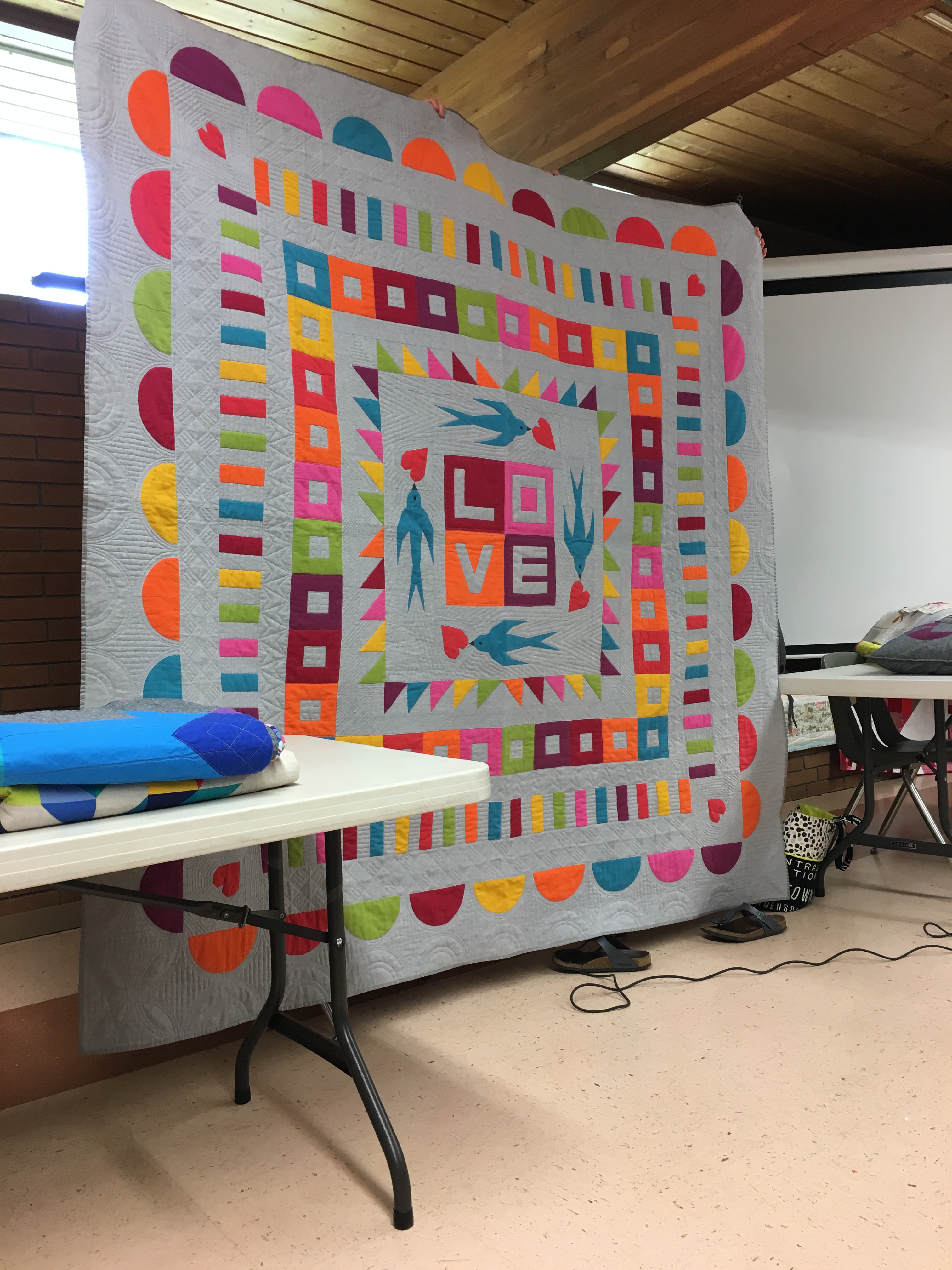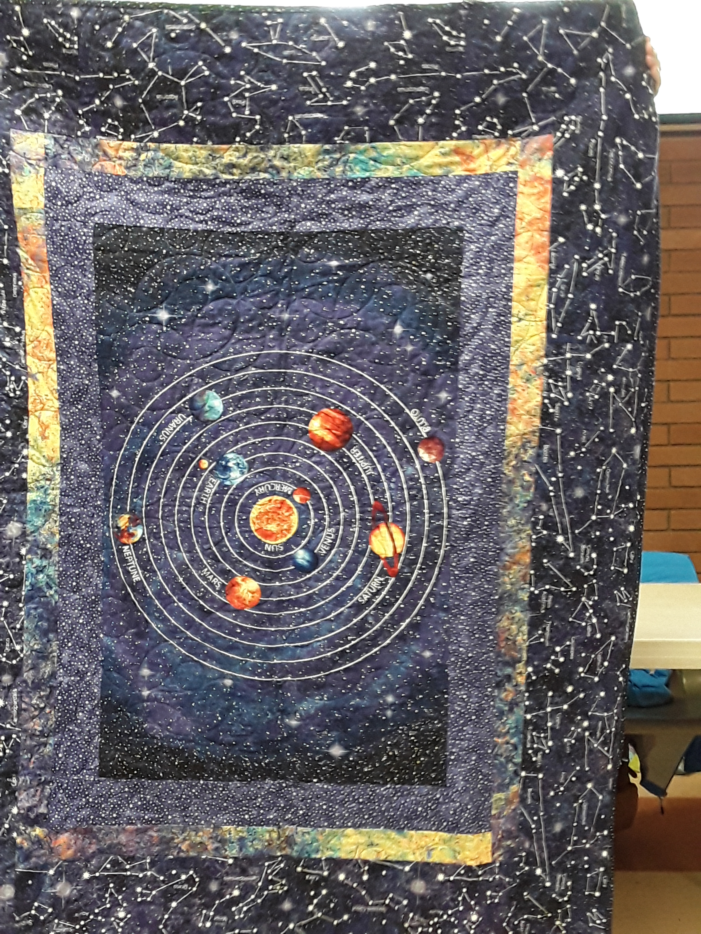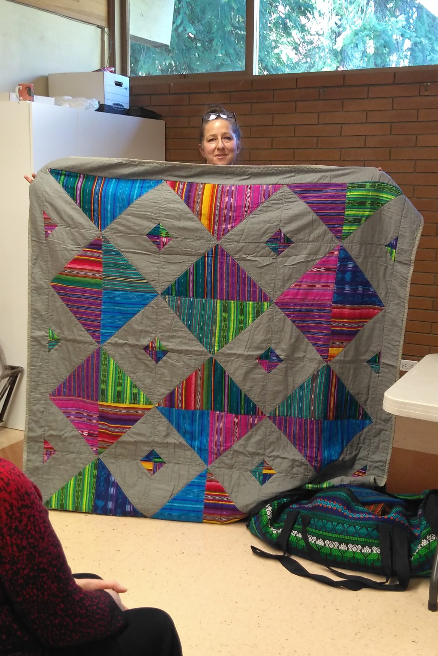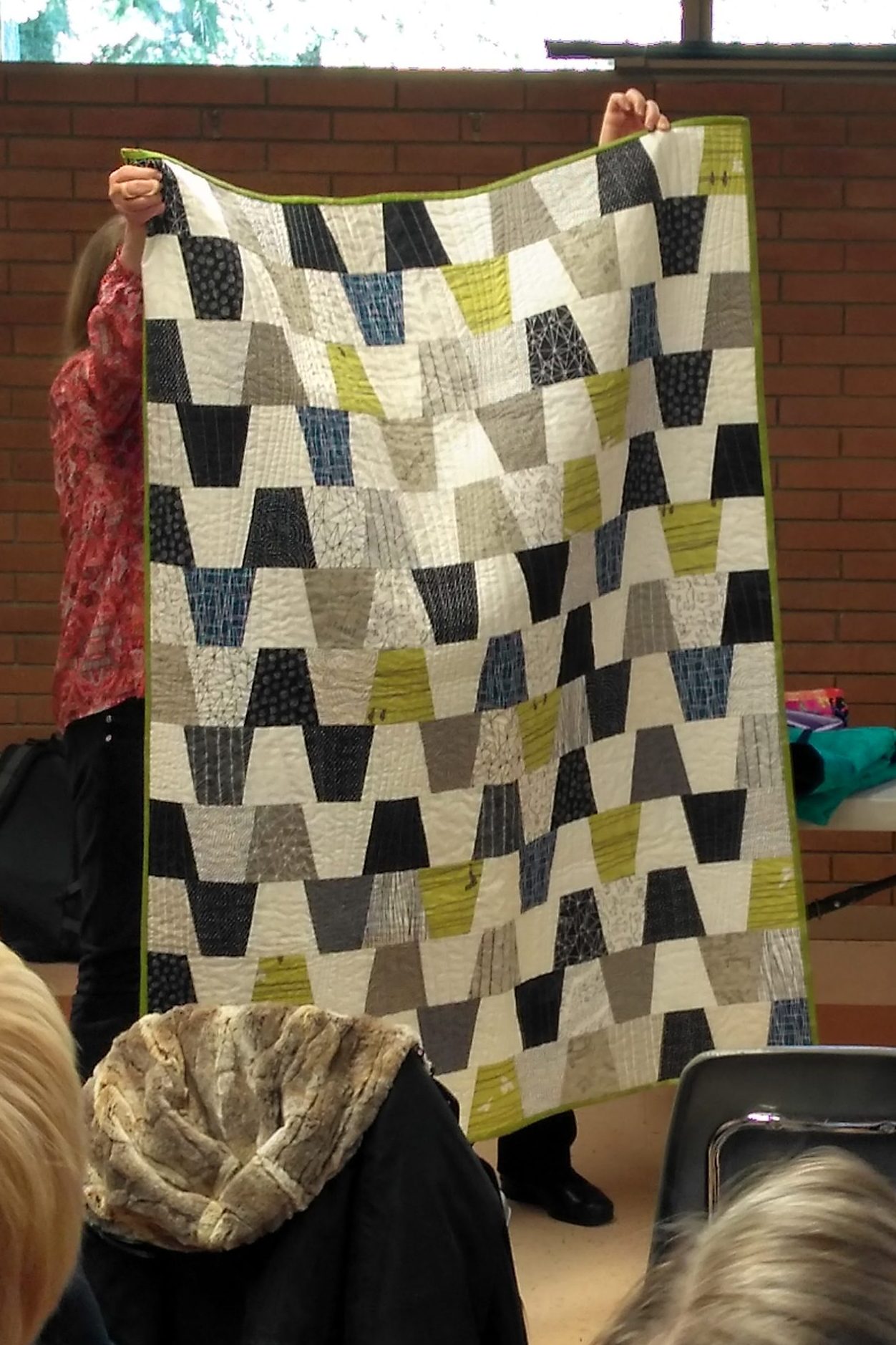 Wendy W sent along these pictures from the recent Boundary Bay Quilters’ Guild show in Tsawwassen, BC. The “hexi” quilt was made by Dougal Walker, who taught the “Wonky Star” workshop for our guild in 2018.