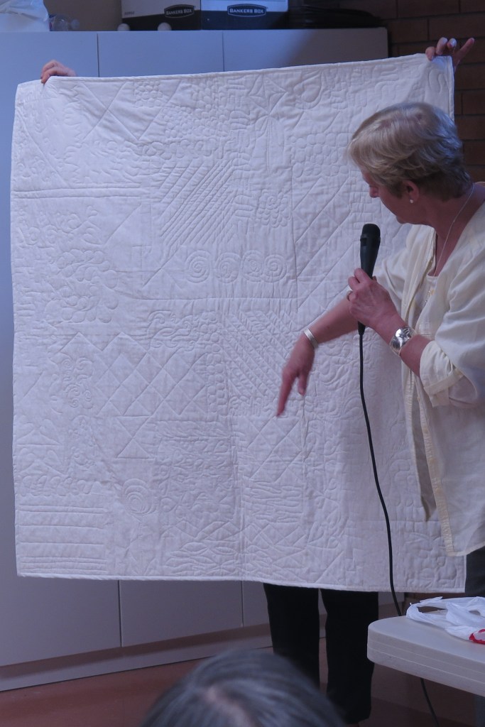 Joe Cunningham was the presenter at the last Coachella Valley Quilt Guild Meeting. He had a 10 year career as an entertainer before his quilting career so he started his presentation off with a song accompanied on his guitar. He has written many books on quilting and even found two of his in among those offered for sale on the share table, which quite amused him. He does not use patterns and does both hand and machine quilting. He was very entertaining and had a great sense of humour.